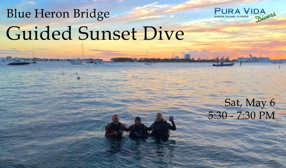 Join Pura Vida Divers for a Saturday, May 6 Sunset Dive at Blue Heron Bridge. This is a FREE event! An in-water guide will be provided.