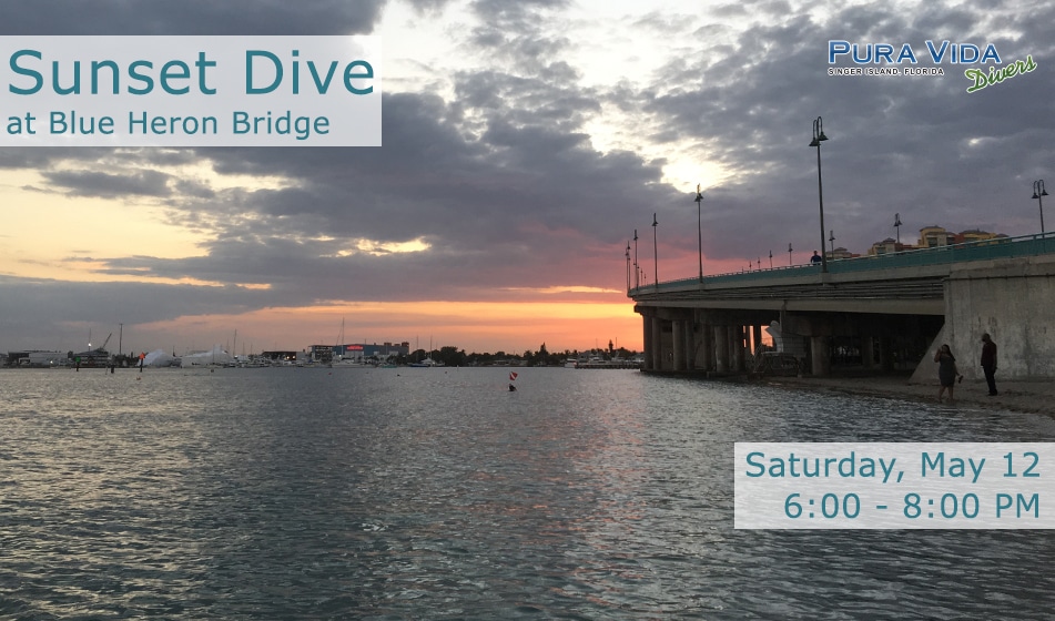 Join Pura Vida Divers for a Saturday, May 12 Guided Sunset Dive at Blue Heron Bridge. This is a FREE event! Divers may register to follow an in-water guide, dive independently with their own flag and float ball, or schedule a Private Dive Guide.