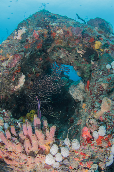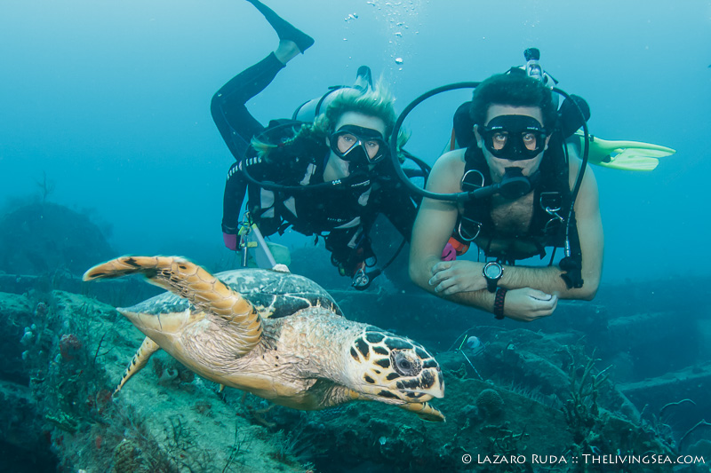 As soon as we descended to the wreck, I could hear the loud barking sound of a goliath grouper. This dive site always has an elaborate concentration of soft corals and sponge that makes for some wonderful photography. Nurse sharks are usually seen resting inside the large concrete culverts. A small, friendly hawksbill sea turtle swam along the divers for a while giving several divers the opportunity to pose beside it for a photograph.