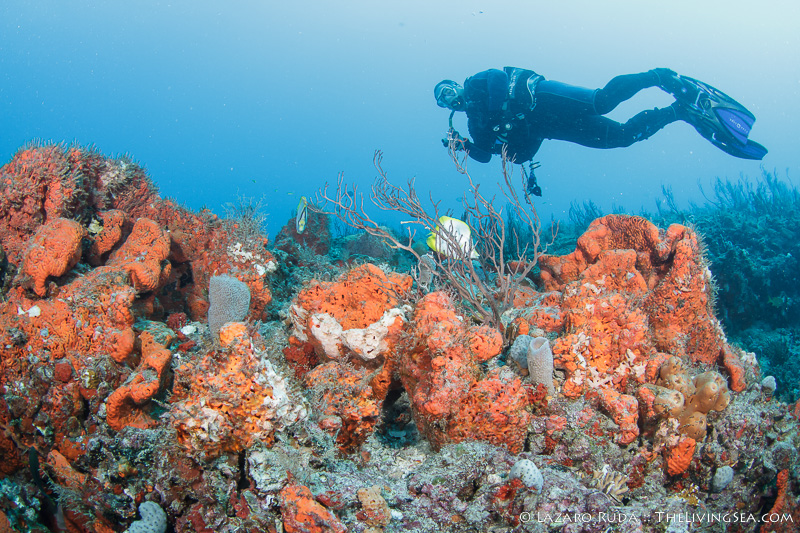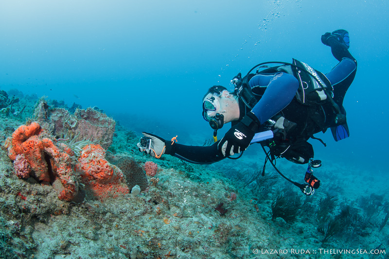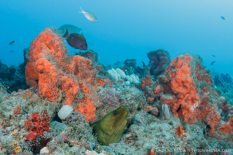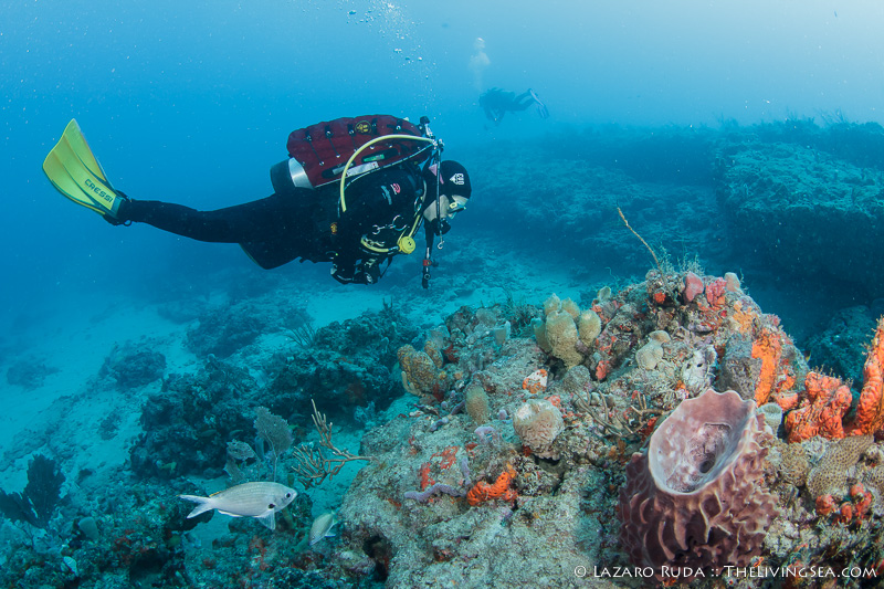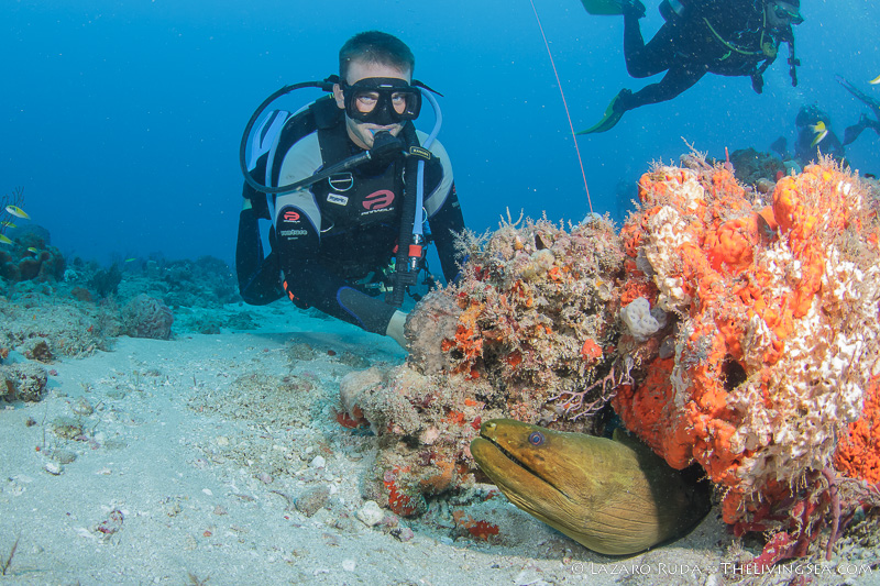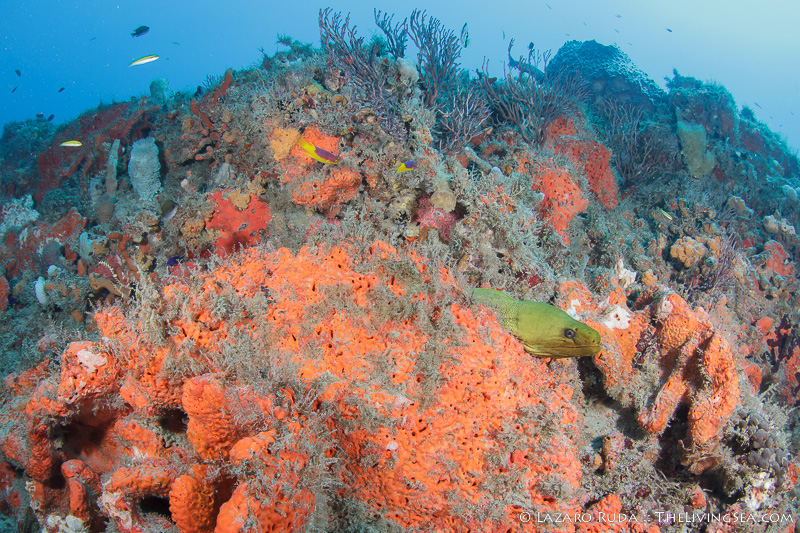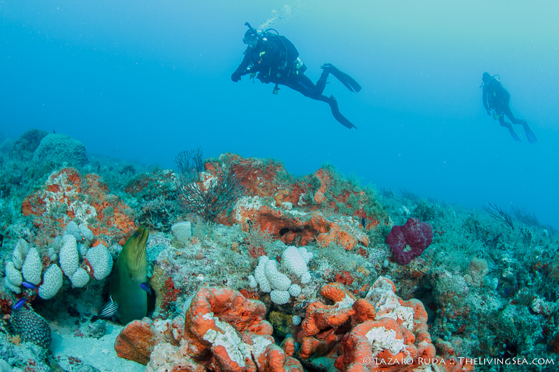 Staying on the top of this double ledge reef system, we swam through huge schools of tropical fish. We explored the 10ft. tall ledge adorned in colorful sponges and corals. A large green moray seemed curious of the bubble-making creatures drifting over his home.