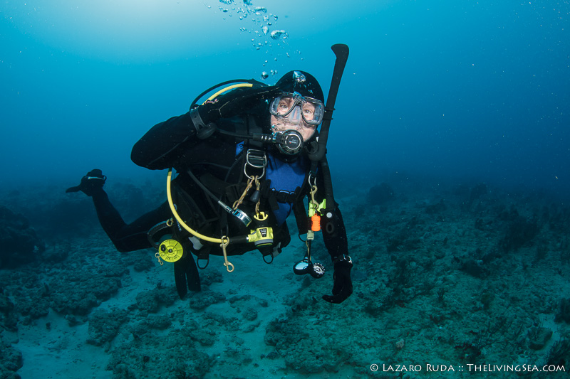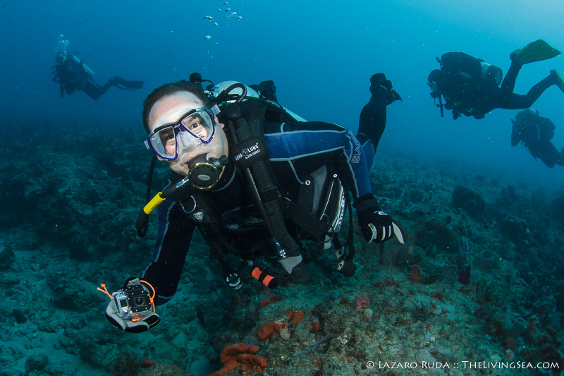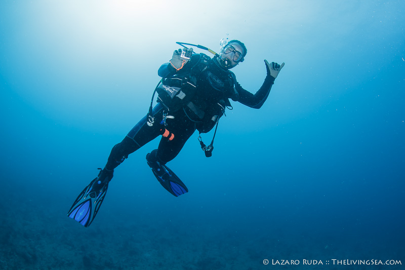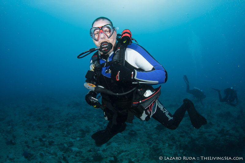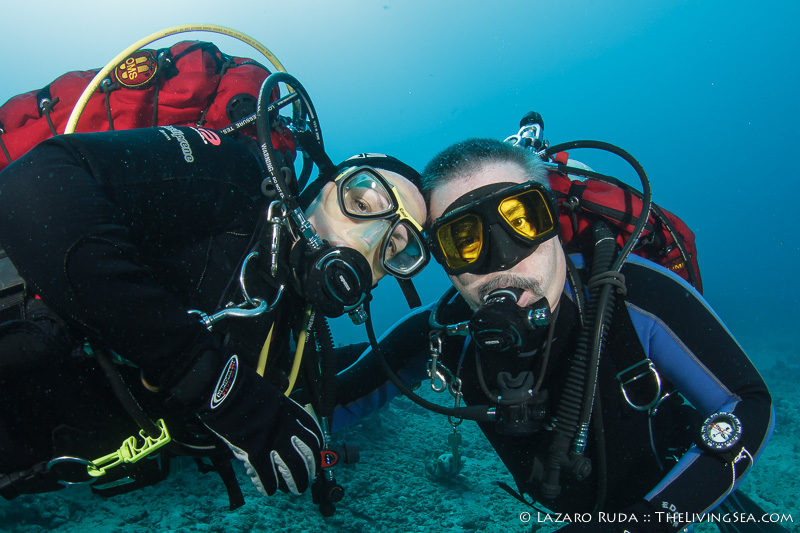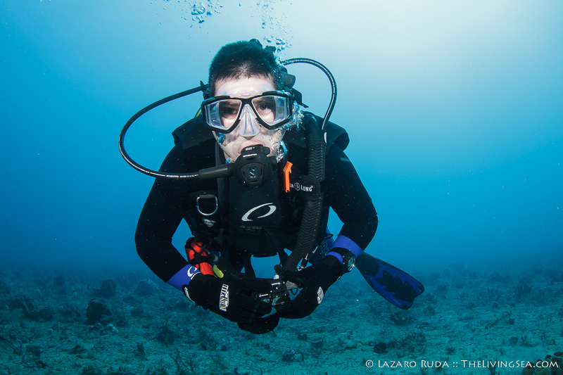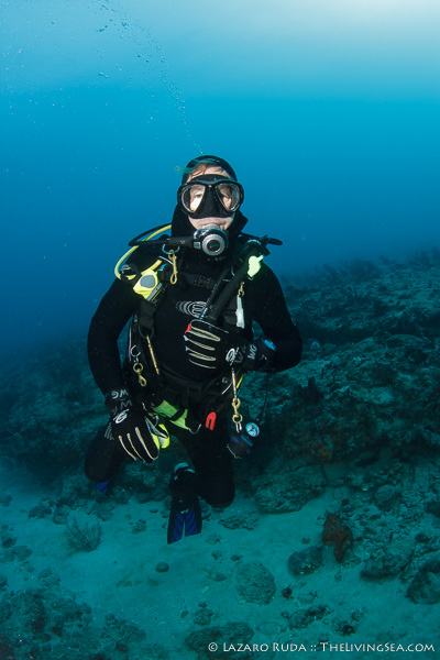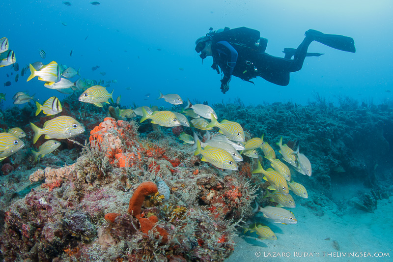 Staying on the top of this double ledge reef system, we swam through huge schools of tropical fish. We explored the 10ft. tall ledge adorned in colorful sponges and corals. A large green moray seemed curious of the bubble-making creatures drifting over his home.