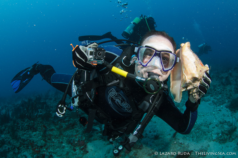 I had noticed a couple of days ago that the poor goliath grouper had a fishing lure caught on its second dorsal fin. With a couple of the divers distracting the grouper, I was able to swim above him without him noticing. Quickly and carefully, I pulled the hook from its fin. The grouper let out a loud bark, stirred the sand, and quickly turned around to look at me face-to-face. In my hand was the lure, hook and all.