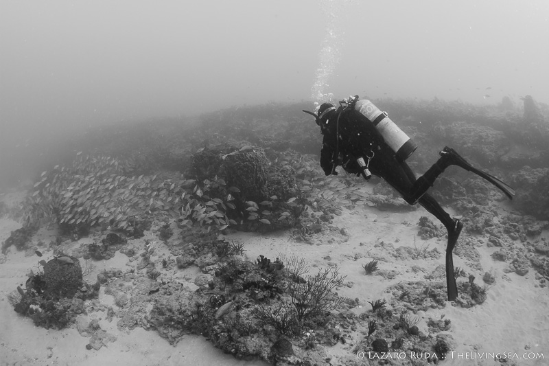 A couple of divers at the front of the group began to rattle their noise maker. Looking around the area, I had a good idea what was exciting them so much. A large goliath grouper, measuring in at around 3-4ft., has been roaming around this part of the reef for the last couple of days. This time around the grouper seemed a lot less skittish of the divers.
