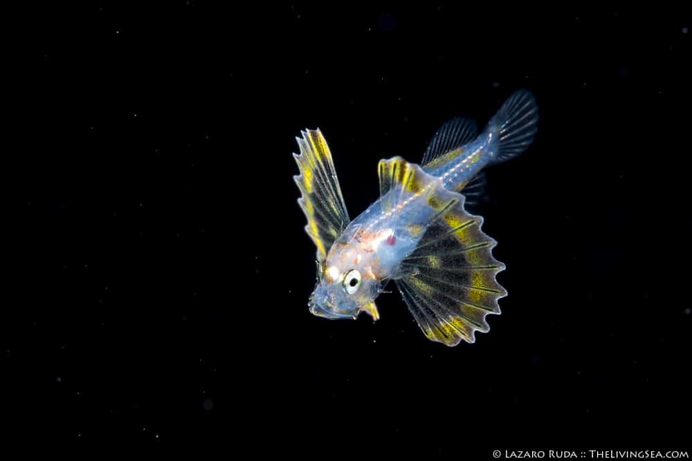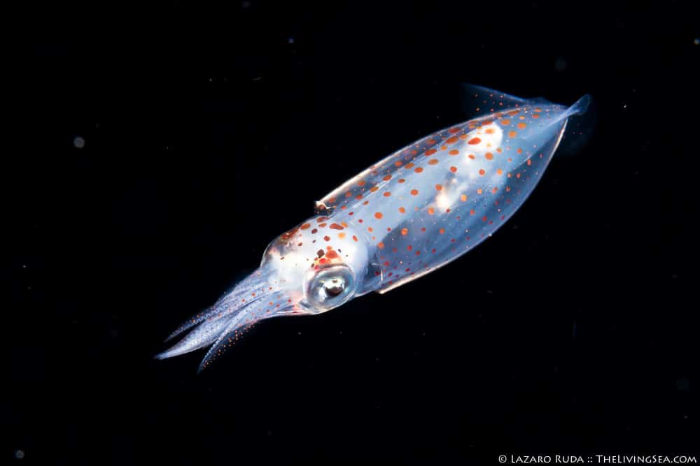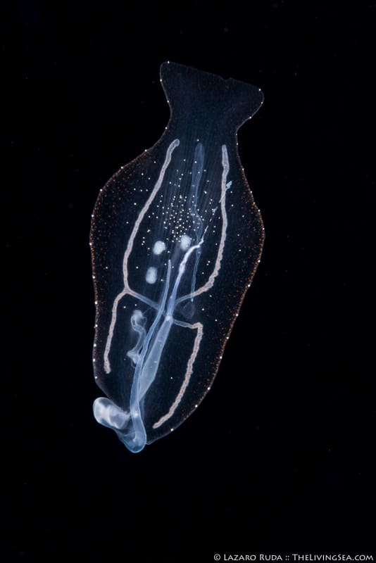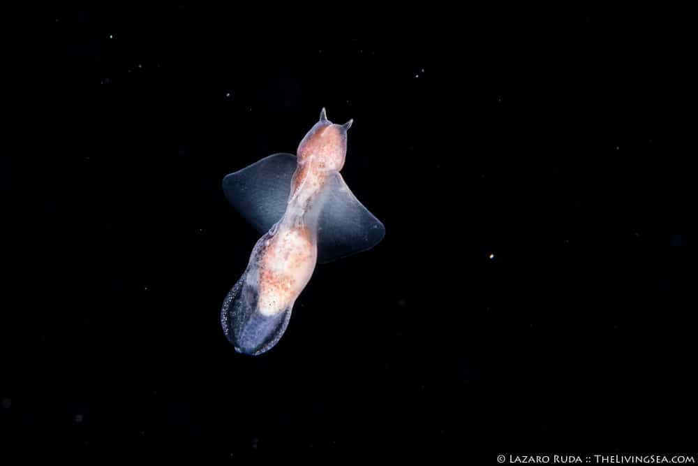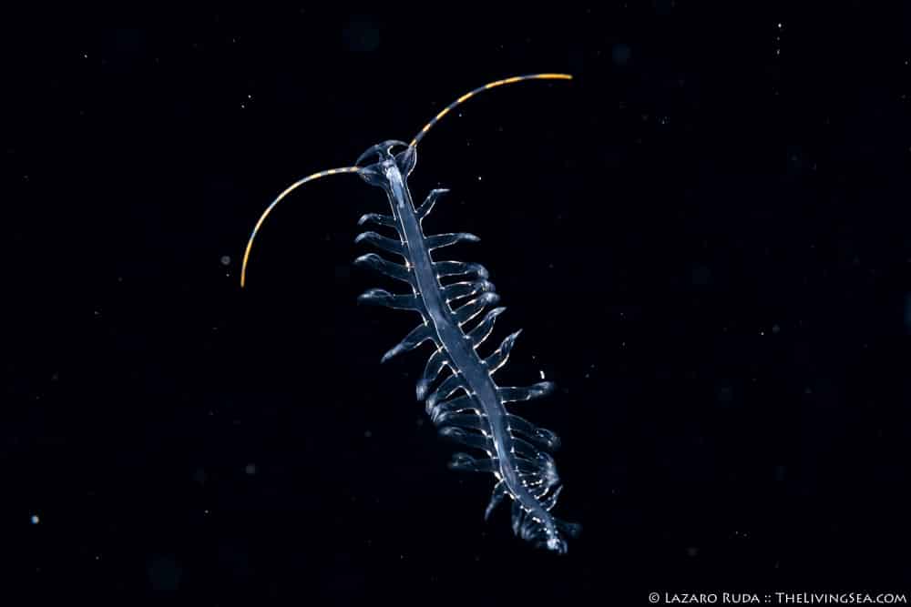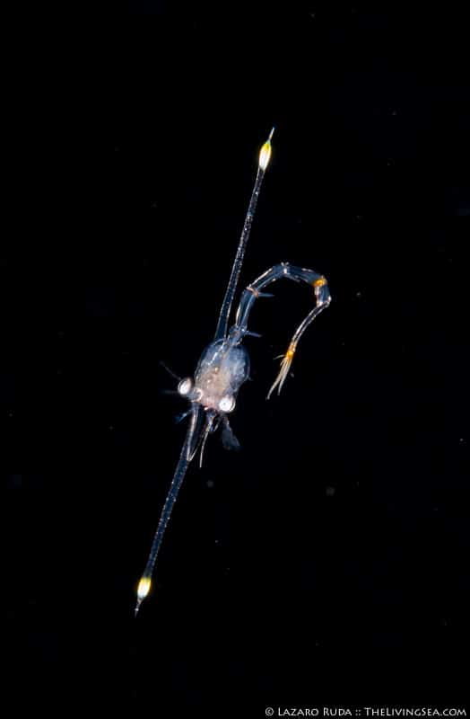 Last night’s Blackwater dive was heavenly. A mix of clear water and strong currents, not that we sense it underwater, provided the divers with some great encounters. It was a cinch staying with, what I call, the 1970s disco float ball (John Travolta would be dancing in his white polyester suit to the lights on this ball). Speaking of 1970s disco, one of the sea creatures I saw down there was this 1-inch lobster larvae on roller skates. I see them often hitching a ride on the bells of jellyfish but this little guy had a pair of pelagic tunicates that were spinning him around in all directions (similar to how I look when I put on a pair of skates).