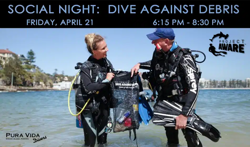 UPDATE: Join us on Friday, April 21st for a Social Night focusing on Marine Debris. Learn how this problem impacts marine life worldwide, and what we can do to help! This event will serve as the classroom portion of the PADI Project AWARE Dive Against Debris Distinctive Specialty. Join us on Saturday, April 22nd at the Blue Heron Bridge to complete the certification.