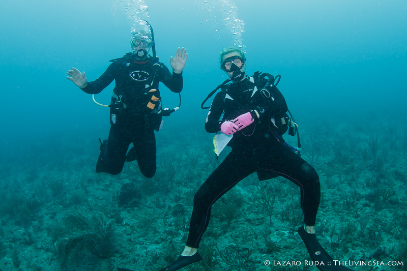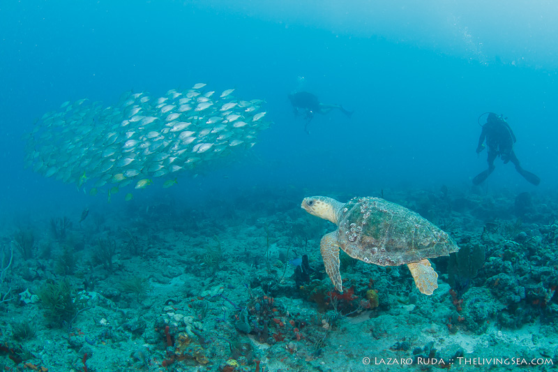 Lindsay grabbed my attention with her underwater bell as a tiny three foot (or so) female loggerhead turtle swam alongside the school of grunts. As the dive progressed we would encounter numerous other loggerhead turtles and a few hawksbill turtles, too. A nurse shark was thrown into the mix for good measure!