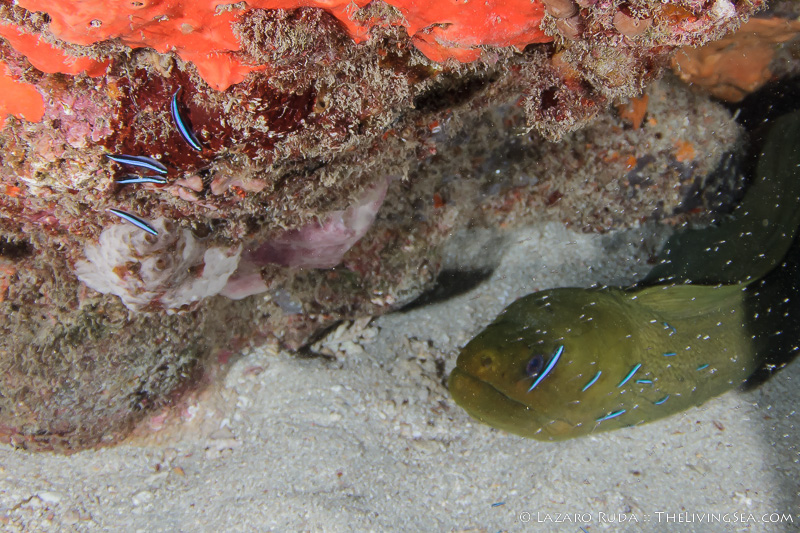 Below us, on the reef, a green moray eel was taking over the cleaning station with over a dozen neon gobies moving throughout the moray’s body. Four gobies were perched on the coral looking down at the moray probably wondering if they wanted to be part of the goby traffic jam.