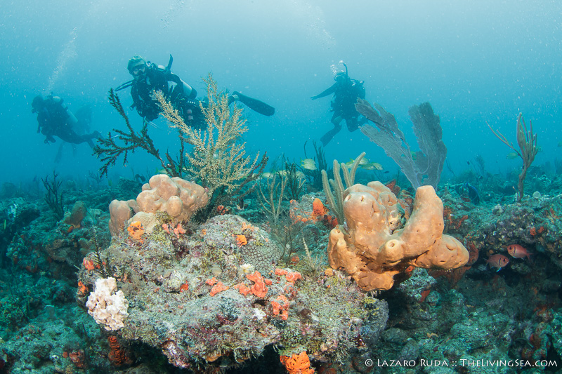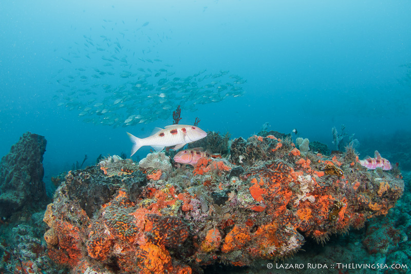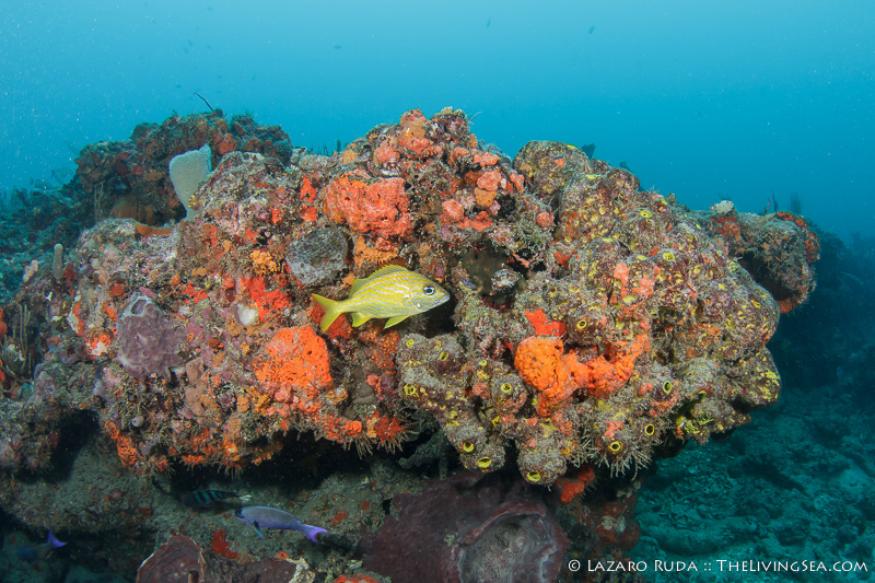 Upon our first descent onto Bath & Tennis reef, we were greeted by a breathtaking school of grunts swarming like flock of starlings. Best of all, the school of grunts was hovering all together high up in the water column. They appeared to be feeding on the microscopic creatures drifting in the current. With no current and 40-50 feet of visibility, enjoying this close encounter was extra nice.