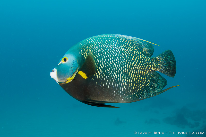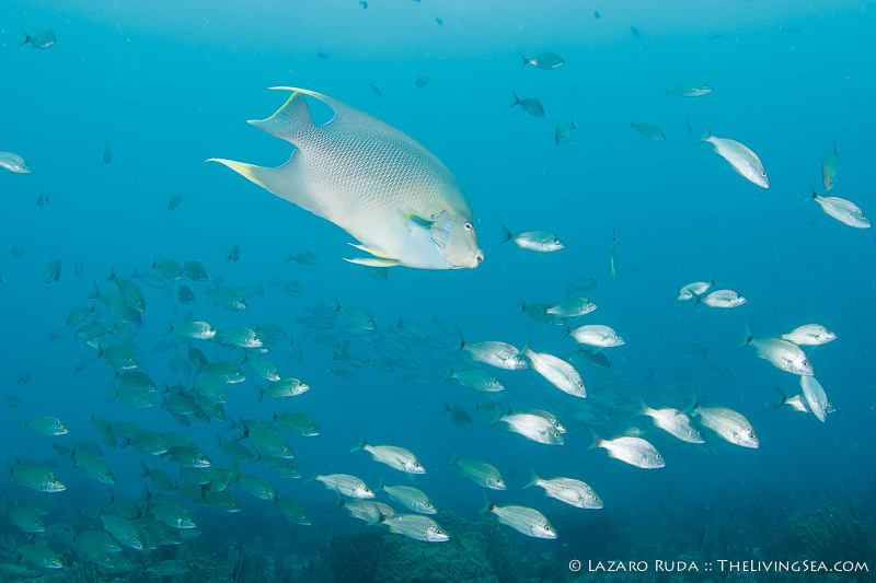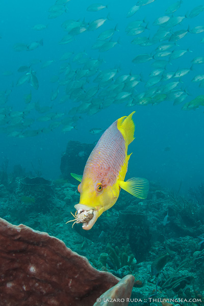 While I was photographing the school of grunts, a spanish hogfish charged towards me with a mouthful of crab. I swam a distance beside him curious to see what it would do. Surprisingly, it would flick the crab towards the reef in what I would guess is an attempt to shatter or stun the crab before grabbing it in its mouth again. Needless to say, it was going to take some perseverance to swallow this mouthful of crab.