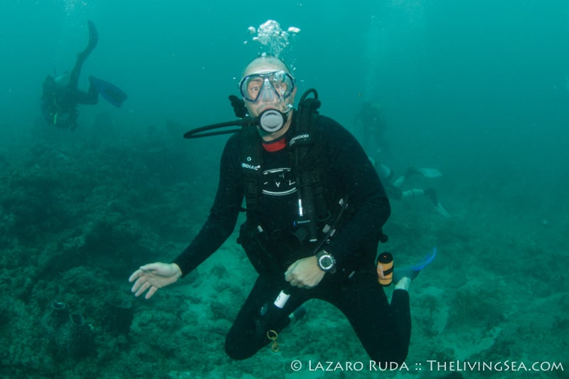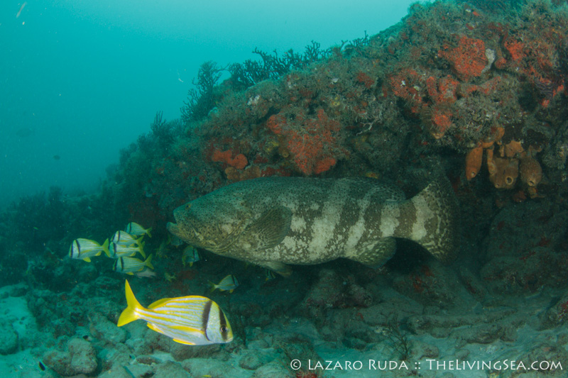 While closely observing the reef, I came across a tiny black brotula fish hiding in the reef. A couple of the divers caught my attention after a few minutes. They signaled me to turn around and just a couple of feet away a very large goliath grouper was staring at me. The number of goliath groupers sighting are beginning to increase in Palm Beach. No doubt a sign of our other amazing dives that take place in West Palm Beach, Florida — the goliath grouper spawning!