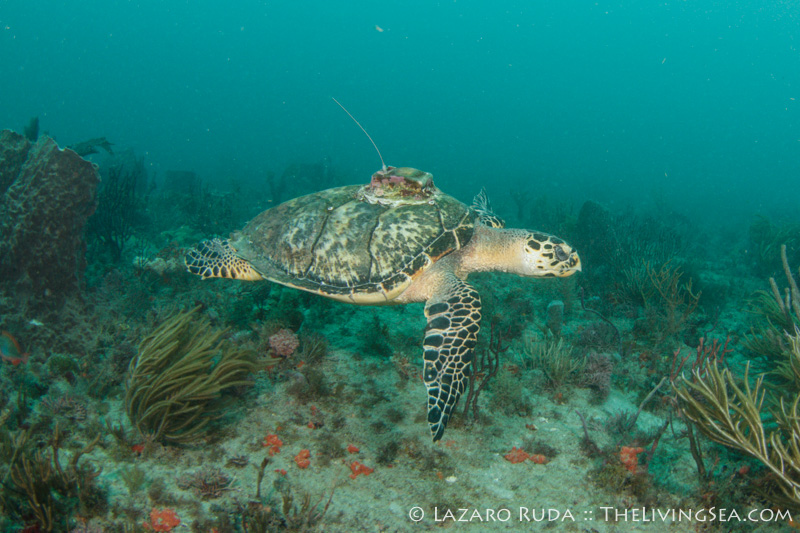 Our second dive was a repeat of the first as far as marine life encounter is concerned. Many more sea turtles — it is sea turtle nesting season after all. In the group of sea turtles we encountered was one of Larry Wood’s satellite tagged hawksbill sea turtle. Fish life was incredibly abundant on Dive-A-Rama and the southern end of Breakers. Another goliath grouper, a large southern stingray with a cobia, and many more lobsters filled the list of today’s scuba diving encounters in West Palm Beach, Florida.