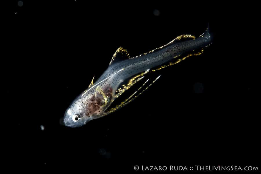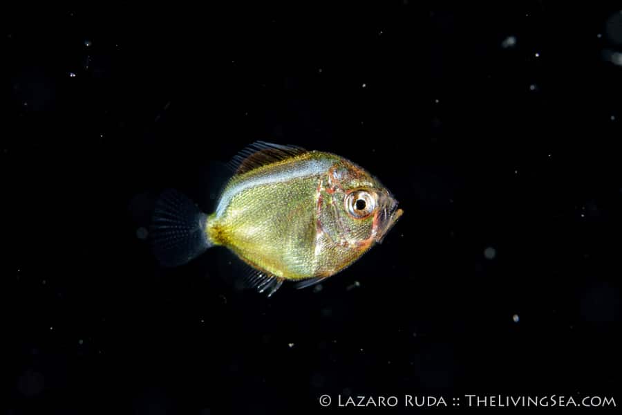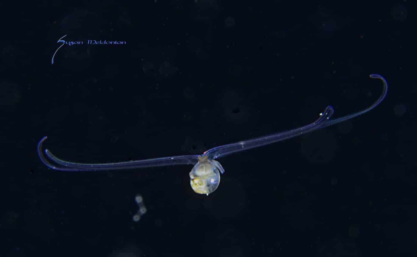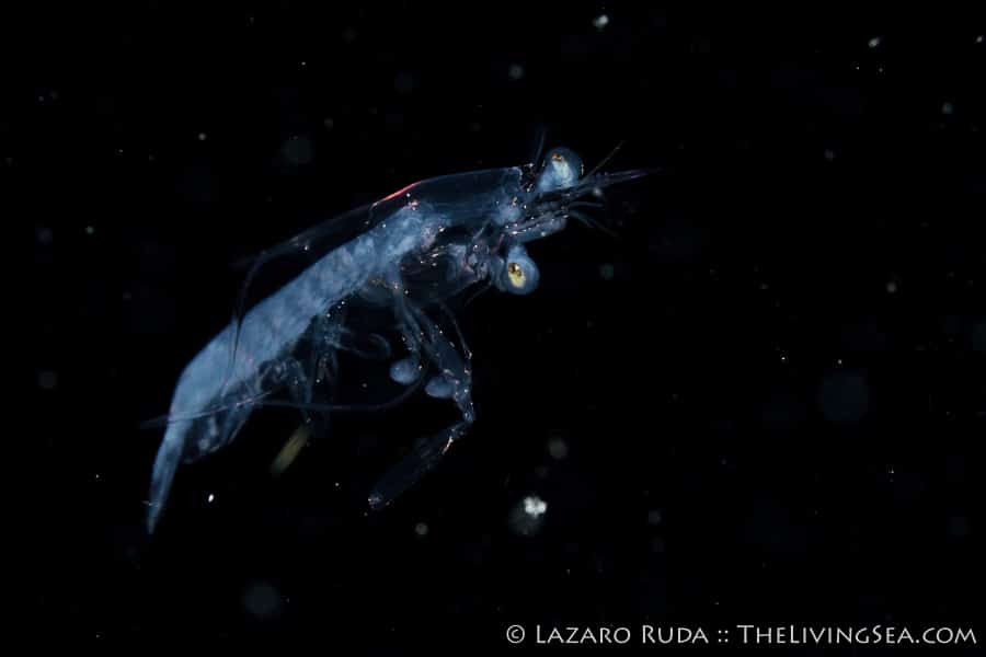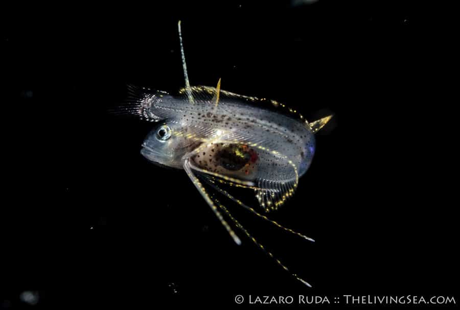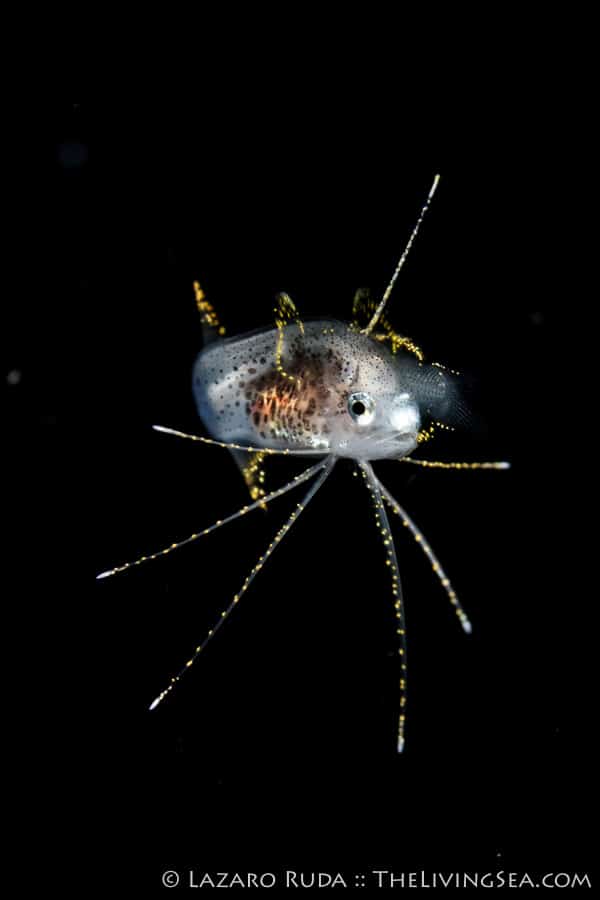 Many of the creatures we see are commonly seen on the reefs during the day except they look nothing alike. Take for example the photo above. That alien-looking creature hitching a ride on a tiny jelly is one we have all seen numerous times, and have eaten them, too! This is no other than the larval stage of a Florida spiny lobster. Of course, this lobster is no where near size limit measuring in at around half an inch.