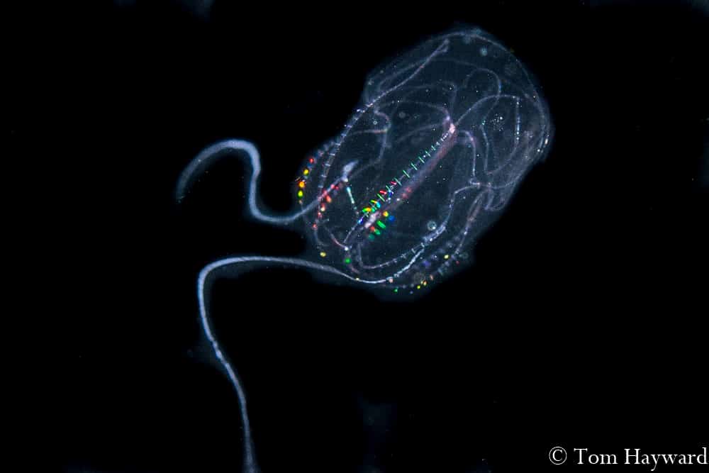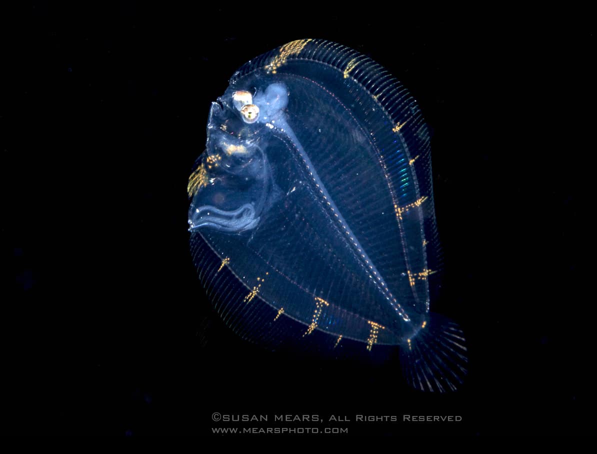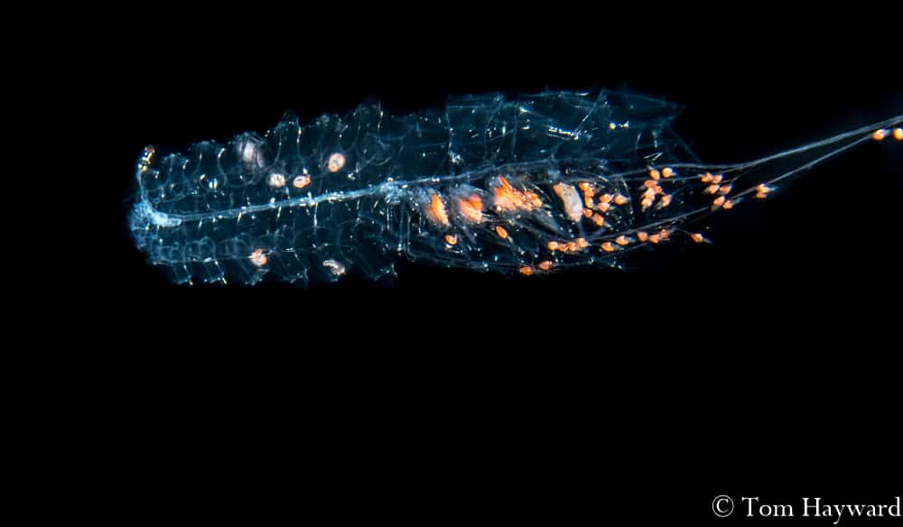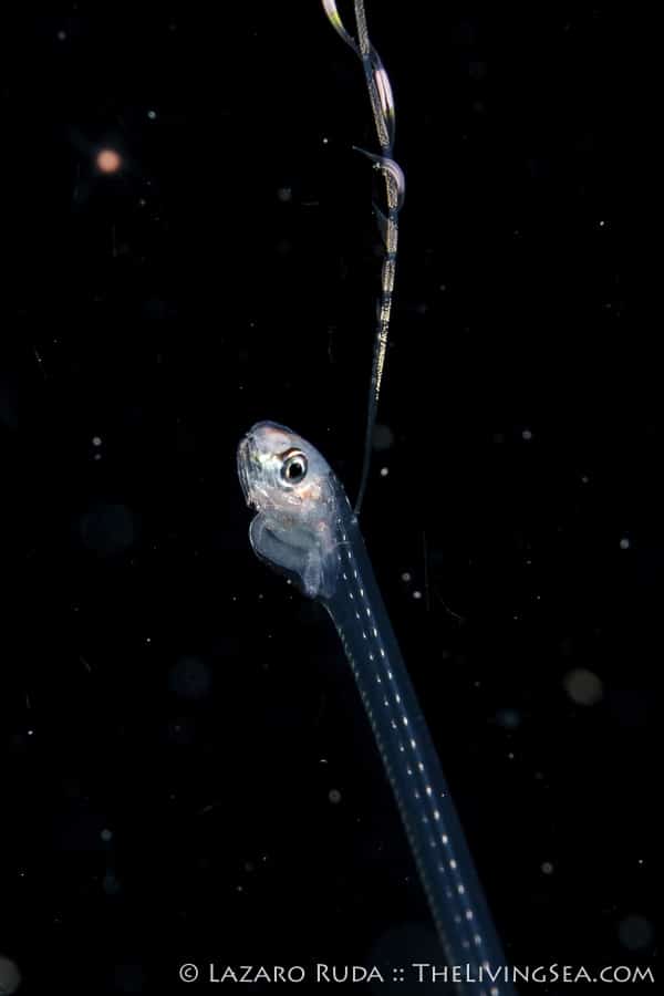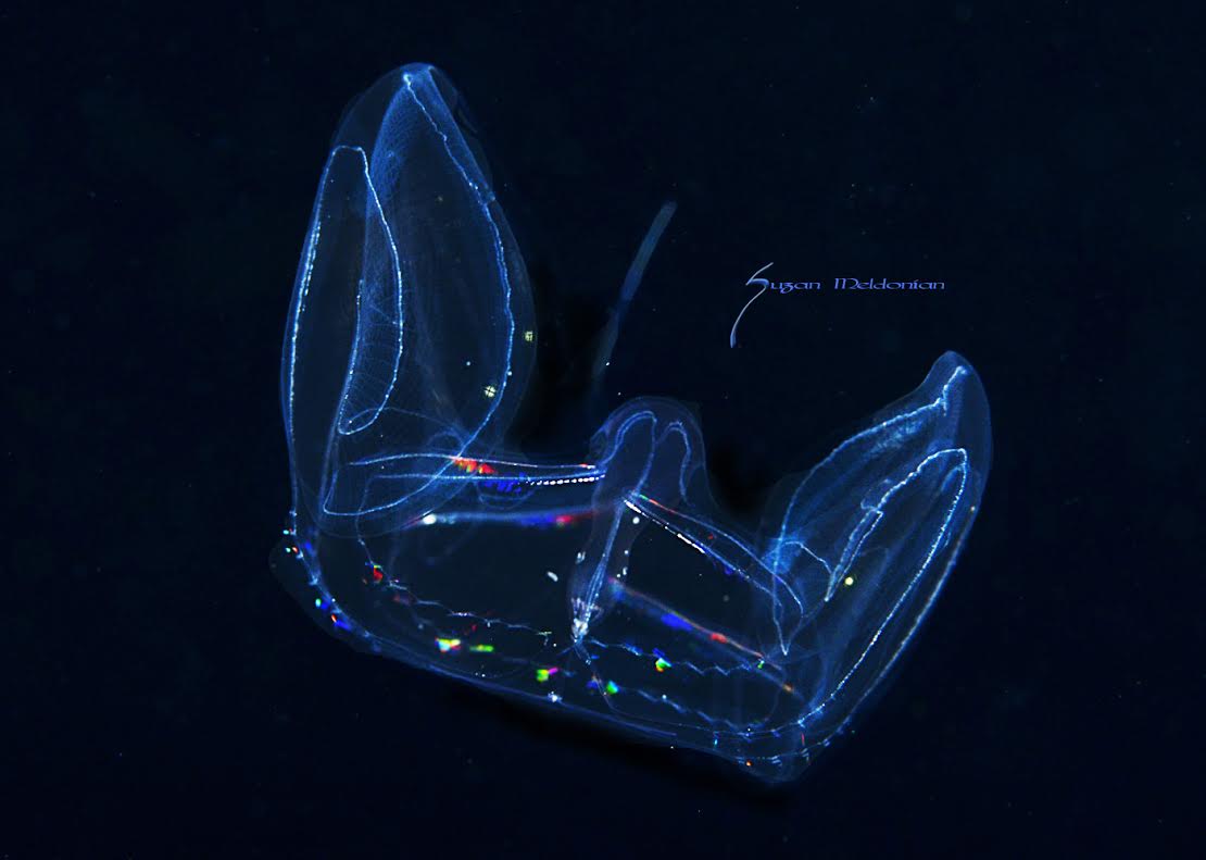 Many of the creatures we see are commonly seen on the reefs during the day except they look nothing alike. Take for example the photo above. That alien-looking creature hitching a ride on a tiny jelly is one we have all seen numerous times, and have eaten them, too! This is no other than the larval stage of a Florida spiny lobster. Of course, this lobster is no where near size limit measuring in at around half an inch.