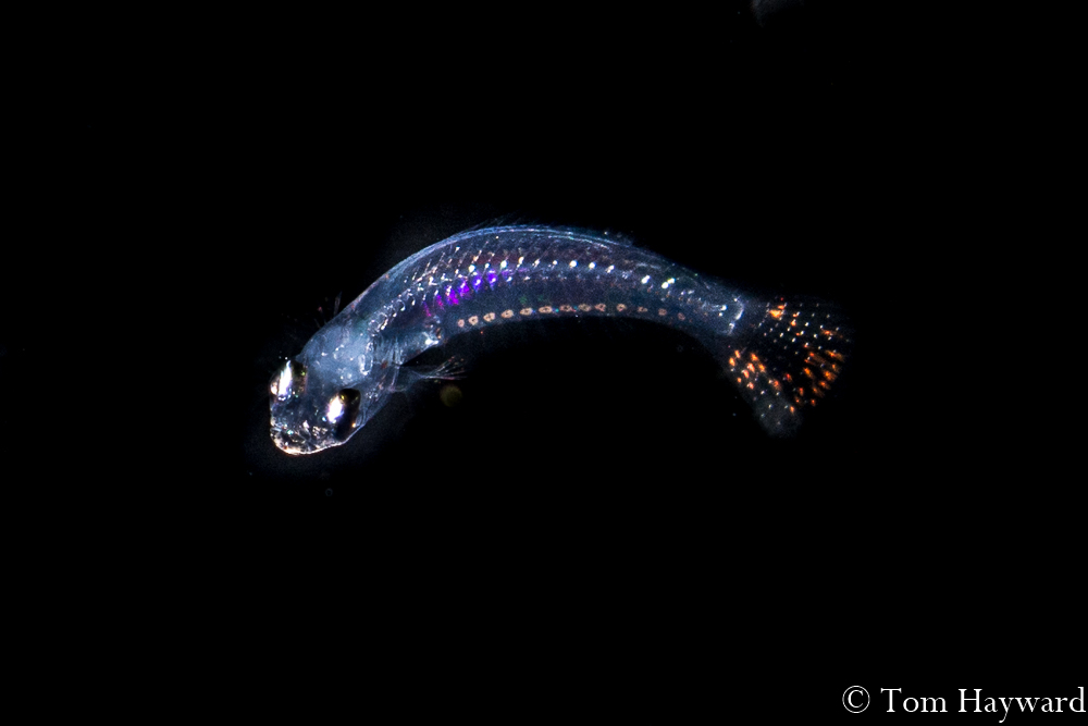 Every night, creatures living hundreds of feet below the ocean surface swim toward the shallow depths in search of food. We dive Black Water drift dives to witness them. See breathtaking bioluminescent creatures, jellies, squid, and the larvae stages of many reef creatures. Each Black Water drift night dive is different and unpredictable. We never know what animal, small or large, will pay us a visit. We encounter everything from tiny fluorescent-colored eels to adult sailfish and dolphins. Many of the creatures observed on the black water drift dives are commonly seen on the reefs during the day, however they look nothing alike. We see jellyfish, squid, lobsters, fish, eels…but usually all at the larval or planktonic level. Take for instance this photo of a Florida Spiny Lobster taken on our Black Water Drift Dive. It looks very different from it’s adult counterpart.