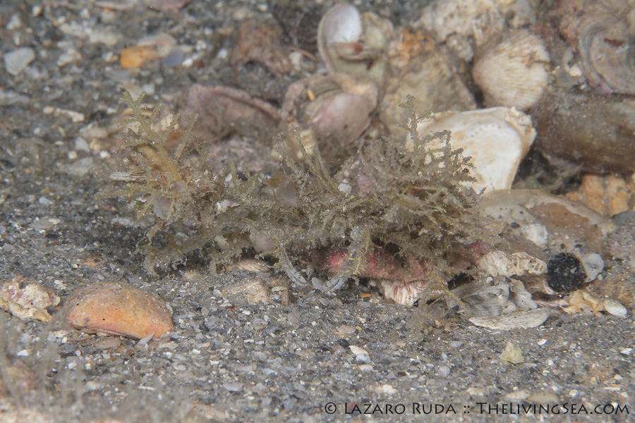 Searching the algae tufts, numerous nudibranchs were found. Numerous decorator crabs in an ensemble of either sponges or algae blended perfectly with their background. The king of camouflage this night would have to go to a crab who used a bivalve shell as a means of protection. Last, but certainly not least, a miniscule (1/4 inch) bumblebee shrimp hovered near a sea urchin.
