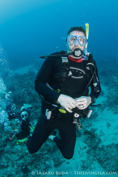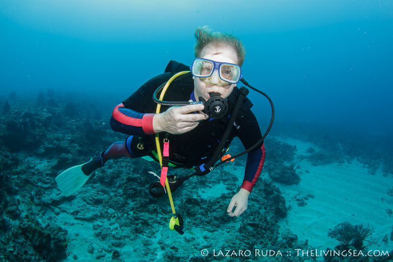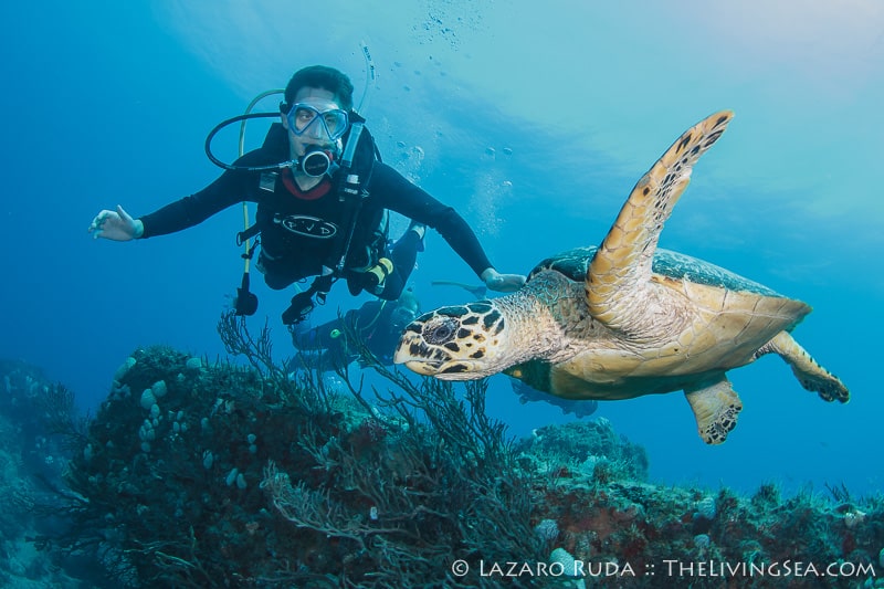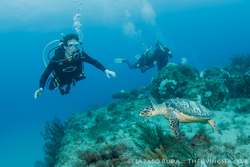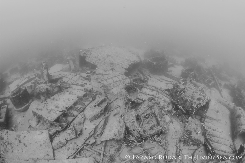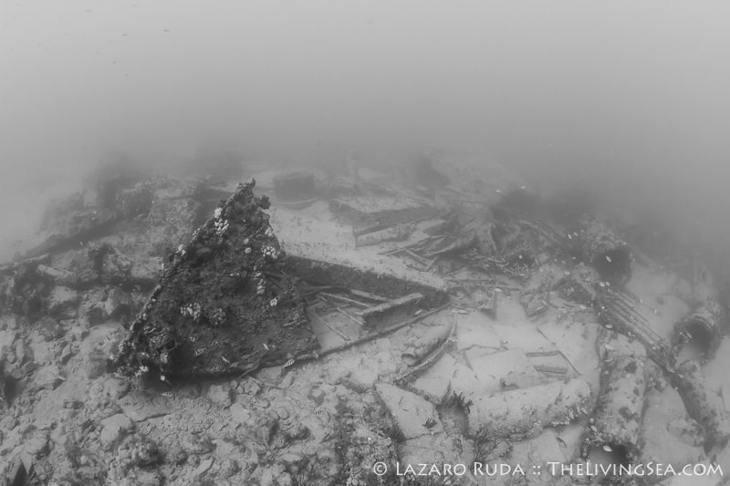 The Toy Box, a huge barge sitting east and west, was teaming with fish life. I was busy photographing the view and divers. I was noticing the amount of fishing line, plastic bags, and anchor line in one spot when Lindsay gave me the cross sign underwater. She pointed under the bow of the barge, and much to my sadness, a tiny green sea turtle lay lifeless. My heart sank seeing this image.
