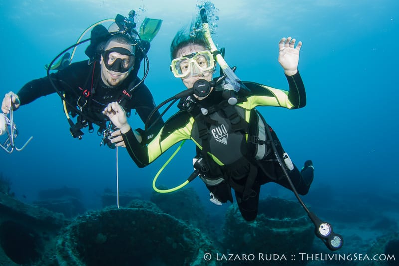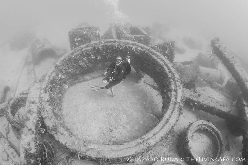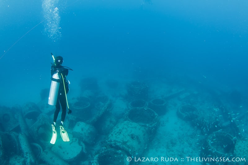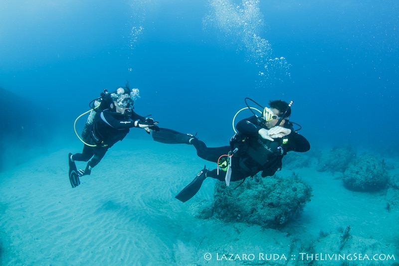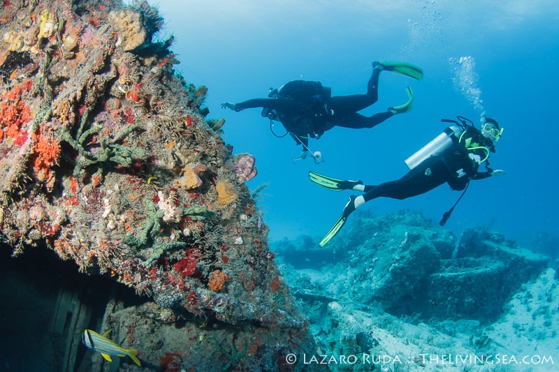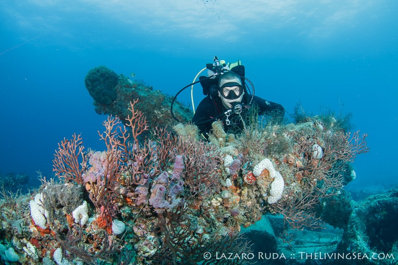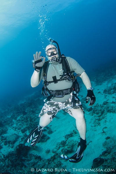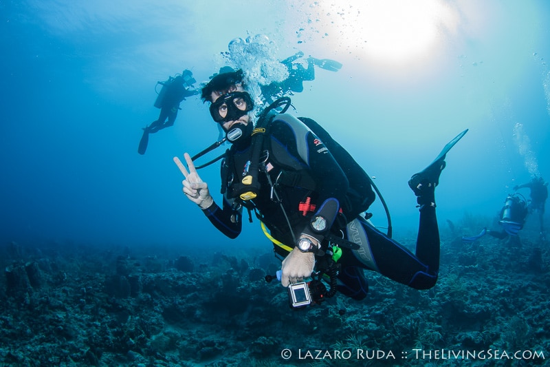 For our second dive we traveled north to a wreck and artificial reef called the Toy Box and Playpen. This dive site is a favorite of many divers. With over 80 feet of visibility, this dive site is quite mesmerizing. The group swam around the Toy Box, a barge sitting east and west. A large congregation of sweeper fish hide in the innards of the wreck. Sergeant mayors dart back and forth from the safety of the rocks inside the barge. Beautiful azure sponges shine in iridescence.