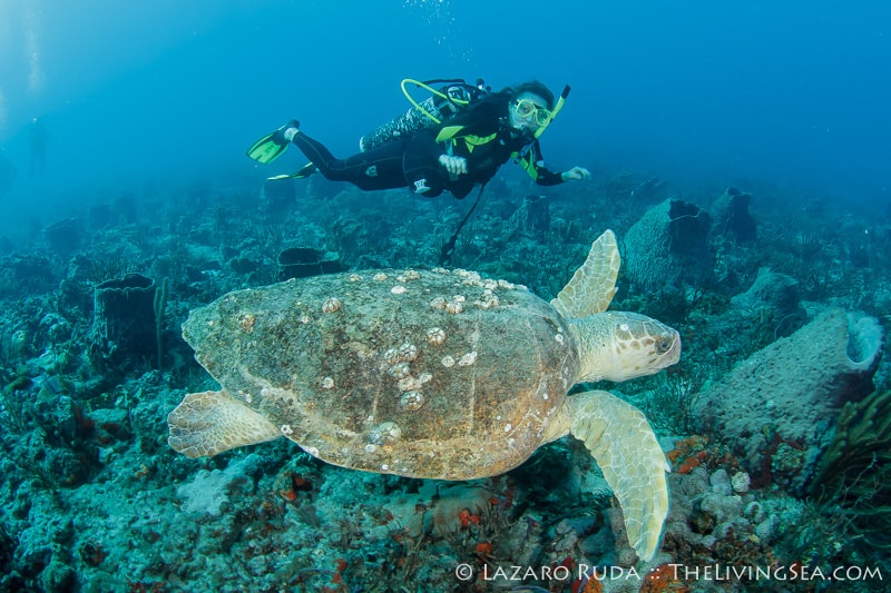 A large female loggerhead sea turtle swam directly towards the group in a slow, deliberate motion. Stopping just short of the easterly two divers in the group, the loggerhead turtle turned and swam parallel with the group for a while giving everyone a chance to enjoy the turtle’s company.