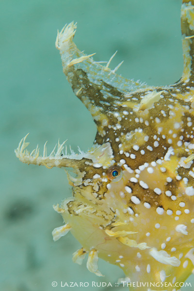 Mother ocean would not let me go on such a somber note. It raised my spirits again as I encountered a sargassum frogfish near the shore. The strong east winds had brought in numerous amounts of sargassum sea weed to the shore. Unfortunately, this little fish had just lost its home to the littoral zone. It was out swimming near the water’s edge when we saw each other. Within seconds, it swam directly towards me — quite the odd behavior. As I sculled backwards, the frog fish continued in its pursuit.
