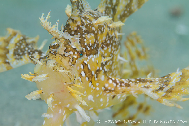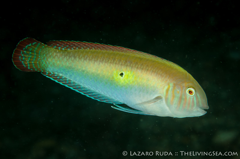 Nearby, a tiny female lancer dragonette scurried along the bottom. Upon a distance view, these tiny fish appear quite bland in color. It isn’t until you view them under the meticulous view of a macro lens that the fish’s colors stand out. When attracting a mate, these tiny fish display a dazzling show of colors.