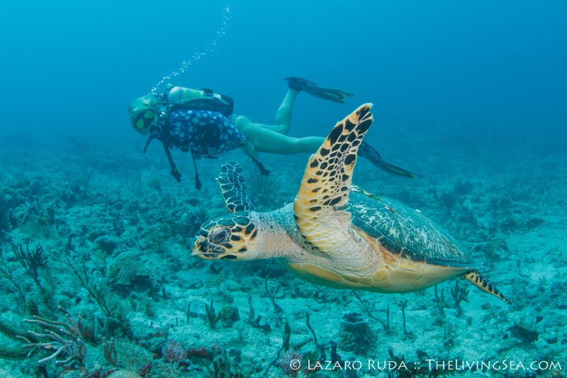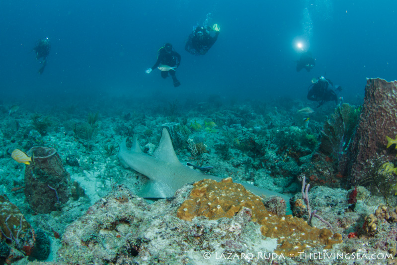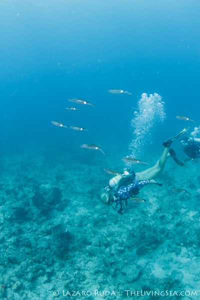 Throughout our hour long dive we encountered numerous sea turtles including hawksbills and countless loggerheads. A couple of eels, a spotted and a green, were busy swimming along the reef hunting for lunch. A gorgeous coney, in its uncommonly seen yellow phase, flirted in front of the dive group. Not far away a large female nurse shark who appeared to had recently given birth was resting on the reef. A school of 17 Caribbean reef squid mesmerized the divers. For an hour we were in an underwater bliss.