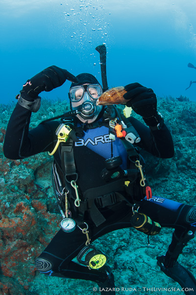 Lindsey was guiding the group this time. Her animated, happy demeanor always a welcome treat even underwater. Green morays were posing for the camera. A very friendly female nurse shark, who appeared to have given birth not so long ago, sat patiently as I took her photograph, too. A couple of divers found a special treat… large deer cowrie shells without an animal in them. It seems hurricane Sandy might have killed a good number of these mollusks as divers are finding them on just about every dive. If you’re a shell collector, you definitely want to go out diving in Palm Beach now!