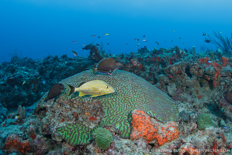 Cue in the marine life! I could tell there was negligible current as the bottom barely moved under my feet. To start off the diving just right, a nurse shark swam out from under the ledge right through the middle of the group. This lovely reef is home to numerous schools of tropical fish, and under this clear-blue veil, the scenery was nothing short of breathtaking.