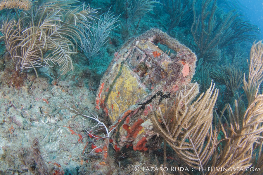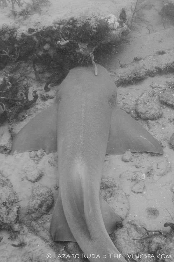 As we zig-zagged the area, we came across a six foot nurse shark who was the unfortunate victim of some of this indiscriminate killer. Stuck in its mouth was a four inch fishing hook attached to 1/8 inch steel leader. A foot back, a second, four inch hook laid precariously on the reef, followed by more than forty feet of 100+ test-pound monofilament line. This fishing line was wrapped throughout the artificial reef trapping the nurse shark to the area. In fact, one of our dive guides had thought he had seen this same shark a couple of days earlier in the same area not realizing it was caught.