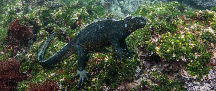 The famous Galapagos marine iguanas have adapted to eating the algae that grows on rocks near shore.