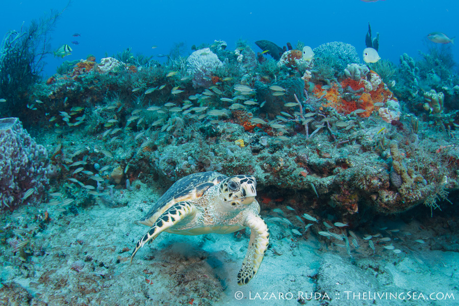 A cute little foot-long hawksbill sea turtle wanted in on the fun, too. If that wasn’t enough… One of the rebreather divers took part in the fun as he sneaked up right beside me as I was concentrating on taking a photograph. Needless to say, I was a little surprised. I guess I better have a word with those rebreather companies to make sure they put some kind of noise-making device like they do on the hybrid cars so they don’t go around sneaking up on people like that! 🙂