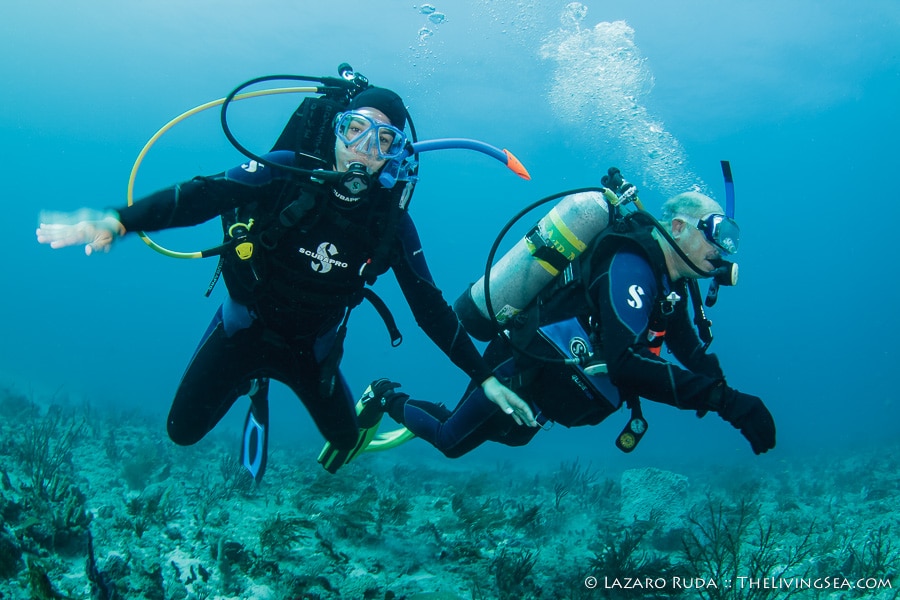 The water appeared crystal blue and upon our giant stride into the warm 78 degree water it was apparent. “If you’re afraid of heights don’t look down!”, I mentioned to the divers. We could see all the way to the bottom sixty feet below us.