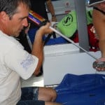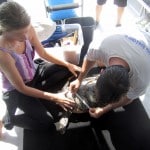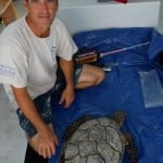 Once we had the turtle on board, measurements and shell preparation began. The carapace (dorsal shell) must be completely dry prior to transmitter application. It must also be slightly “buffed” to allow for adhesion. While her carapace was prepared by Kelly (biologist from the Loggerhead Marinelife Center), Larry took measurements of her width, length, head, and many other features. This little turtle had been captured and tagged approximately one year ago and has grown 6cm since…she must be finding plenty to eat!