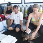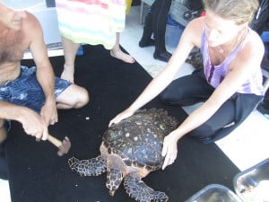 *Please remember that all of the people shown handling these turtles are authorized to do so under a permit. It is illegal to pursue, touch, or harass these animals in the wild. Hawksbill sea turtles are protected by State and Federal Law.