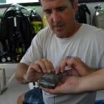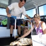 After the turtle’s carapace had dried, Larry and Kelly applied the special glue/epoxy to the transmitter and placed it high on the turtle’s back. The glue takes about 1 1/2 hours to dry so Larry stayed on board with the newly named “Cassidy” while the rest of us went in search of another hawksbill on Flower Gardens.