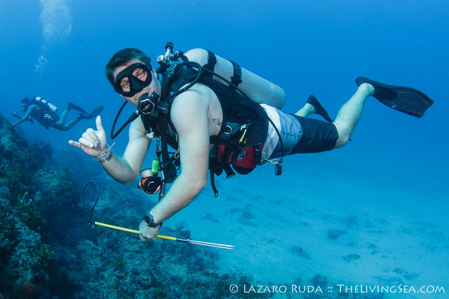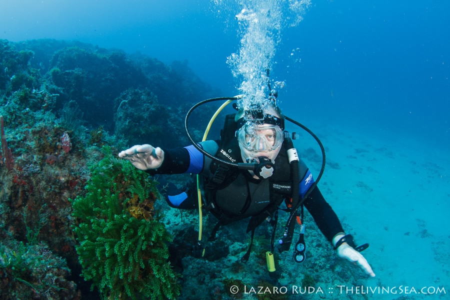 Heading out the inlet we were pleased to find the ocean was glass-calm and the water was crystal-blue. Riding on the dive boat to our first dive site, Juno Reef, we could see the bottom on the way there. Sailfish jumping, bonita breaching out of the water as they surrounded a school of baitfish, turtles, and more… The ride to this northerly dive site was filled with excitement.