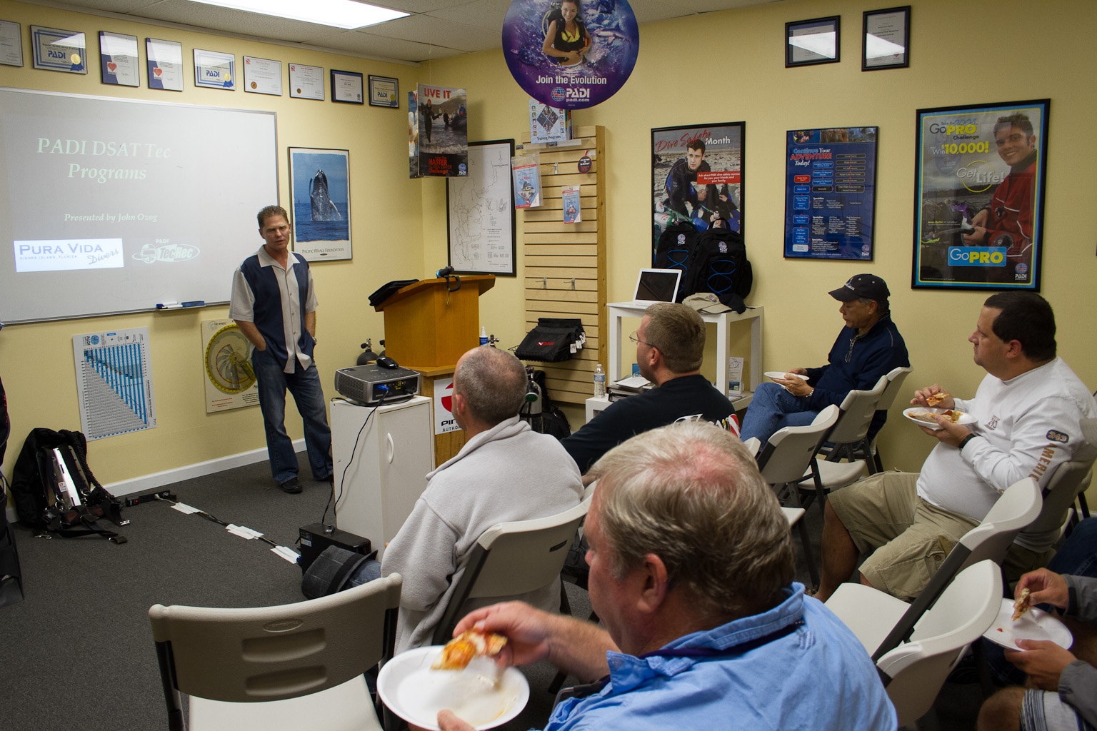 There were a number of guests with a wide gamut of technical diving knowledge present to hear John Ozog’s presentation. At the end of this informative PADI TecRec presentation, Pura Vida Divers gave away a number of prizes, offered a $100 discount on the courses, a $100 discount on dive equipment and 15% off Fourth Element wetsuits to those who attended.