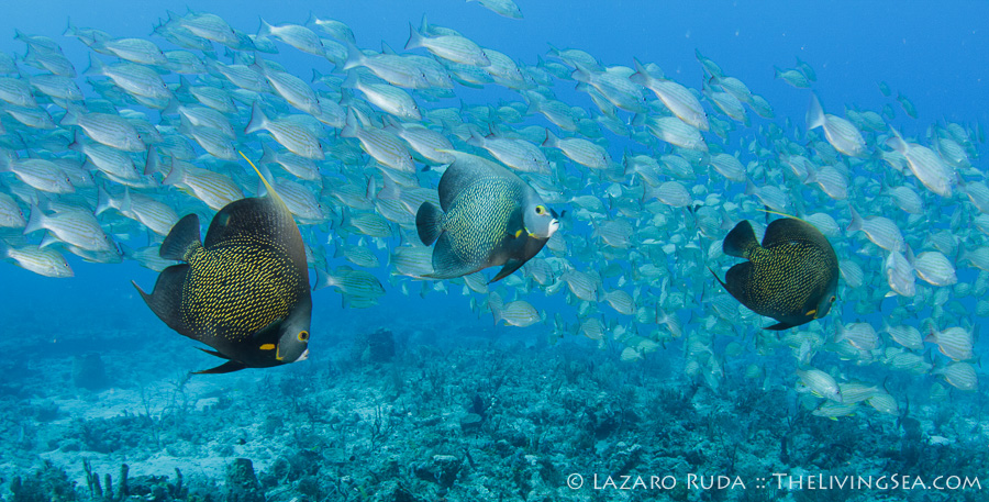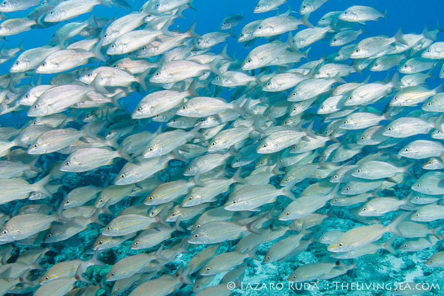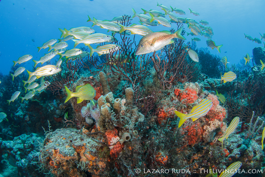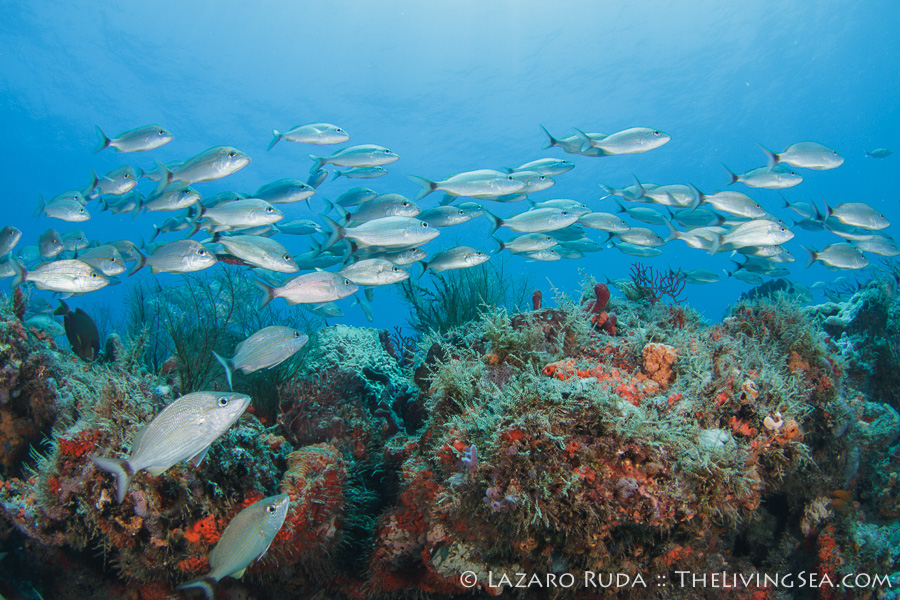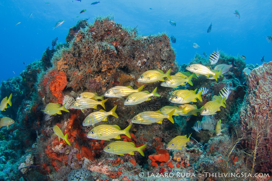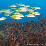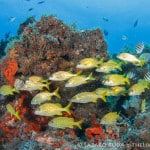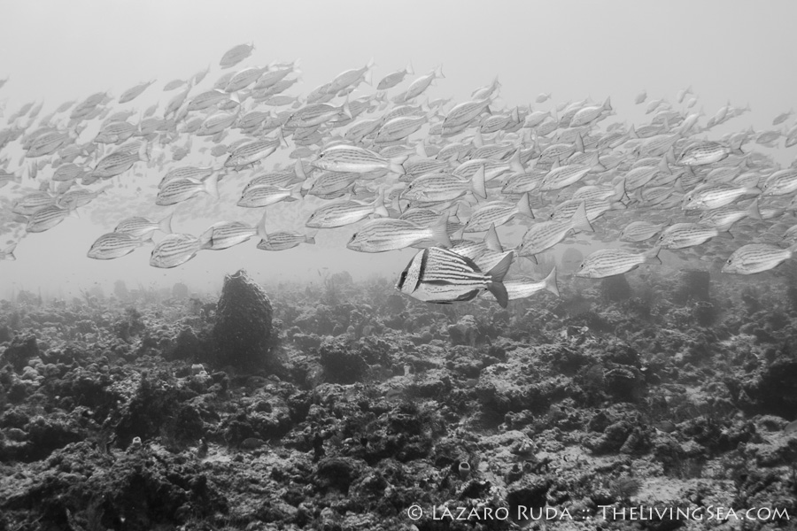 We started off the dive near the Fish Bowl on Flower Gardens. This spot is breathtaking for the shear amount of fish life that schools together. Hundreds, if not thousands, of grunts huddle together in this little section of the reef. Swim into the middle of the school and there is nothing but fish surrounding you as far as the eye can see. In unison they move. Disturbed by a pair of large jacks, this wall of fish sways across the reef.