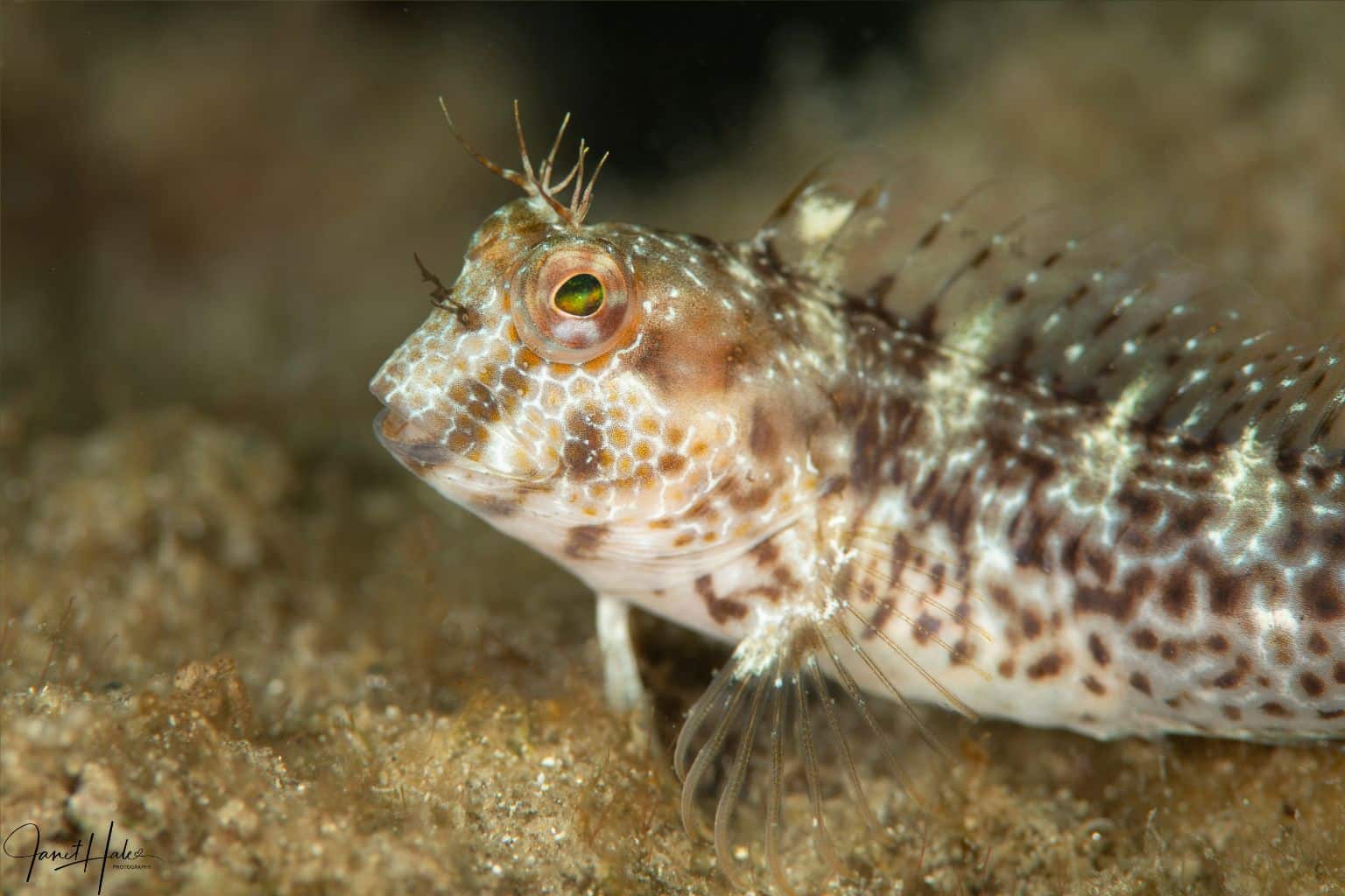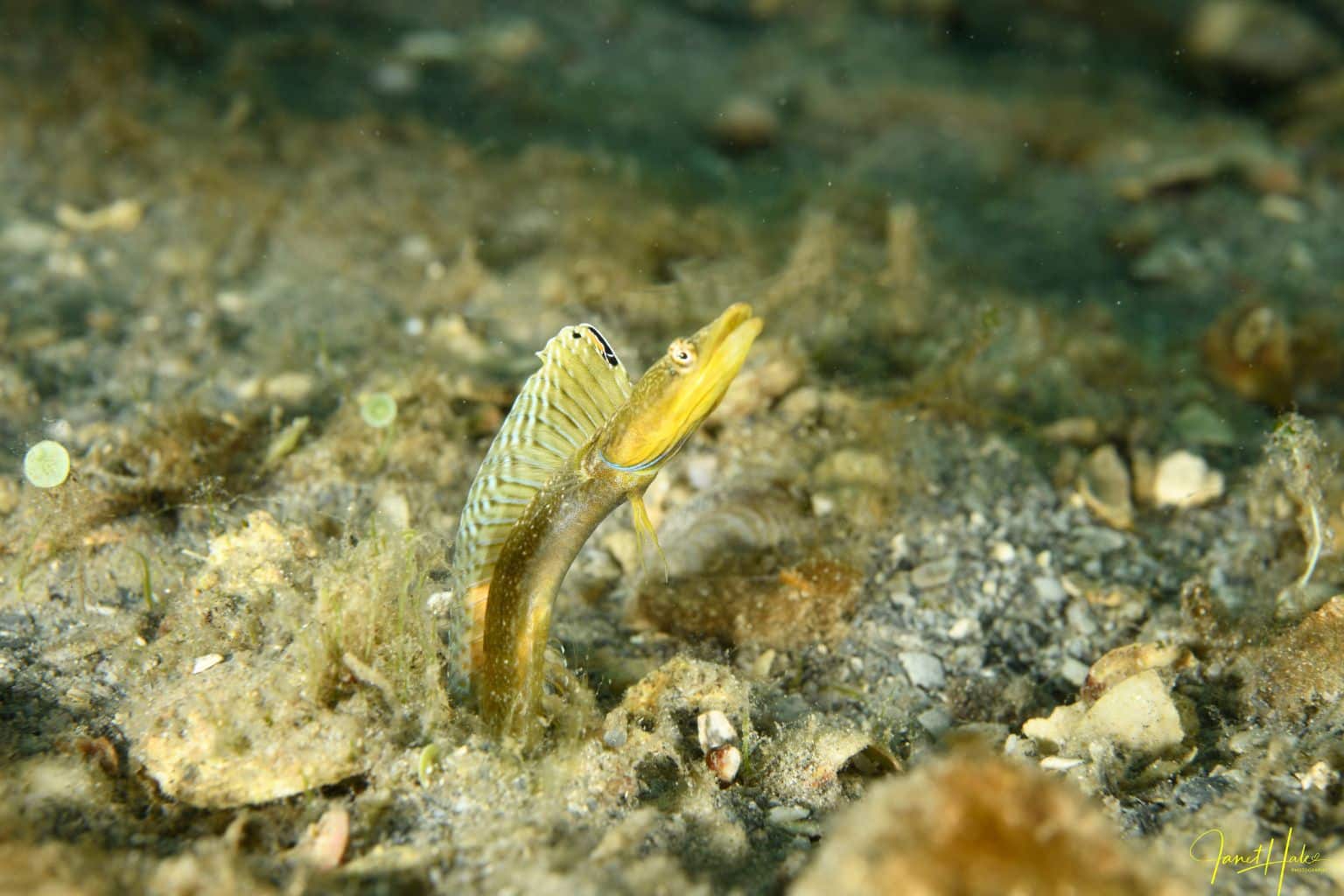 On day one, Janet photographed a small eel peeking out of its hiding place in the sand, featured above. By day four, Janet was handling her camera rig like a pro. She had fine tuned her skills and captured the stunning frogfish image below.