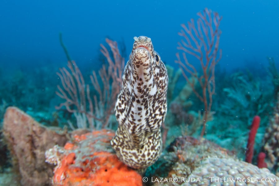 Our first dive was to Ron’s reef where there was something exciting going on around every corner. One particular spot was to take the prize from the get-go. As soon as I approached the spot, a nurse shark was cruising overhead a luscious and colorful reef adorned with all kinds of fish life. In the center there was a whole lot of ruckus going on! A group of jacks with flashing their most vibrant colors and energetically circling the same spot on the reef. A sure sign that an eel was in the neighborhood. Seconds later a spotted eel pokes its head out from the reef with a fish sticking out of its mouth! One look at me and its shy sign came out and he tucked back inside. When it finally came out again, his lunch could be seened bulged just under its throat.