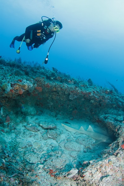 Our second dive was at Jolly Jacks where we, once again, found similar conditions underwater. A tiny 3ft. nurse shark was resting in a crevice in the reef. A green moray and a golden tail moray hung near each other. As we cruised up the reef, numerous empty deer cowrie shells were found.