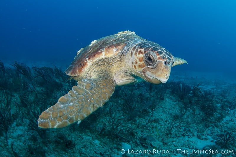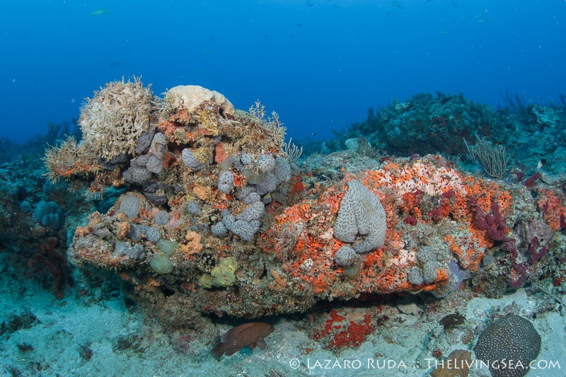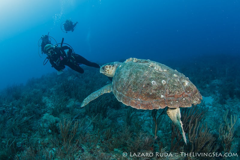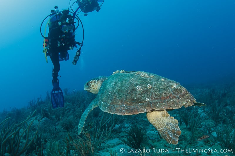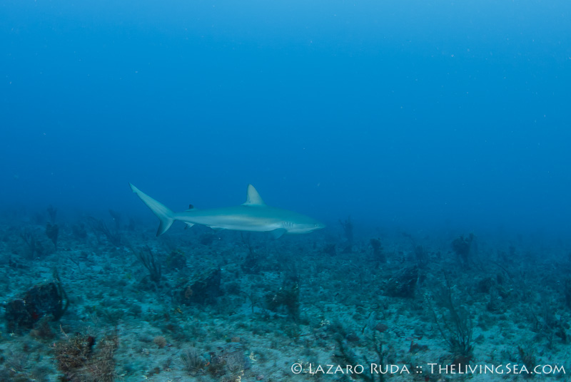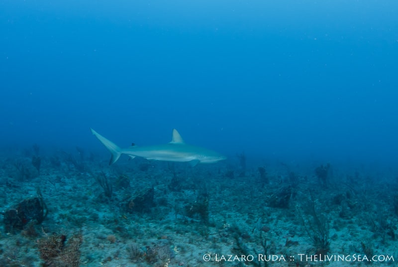 Without much hesitation the sharks began to show up. Caribbean reef sharks swam in and out of view throughout most of the dive. Over a dozen reef sharks were counted, a couple of nurse sharks and loggerhead turtles, too. This reef, with its undercut ledges is always filled with all kinds of fish life. Out on the sand, plenty of stingrays were laying about.