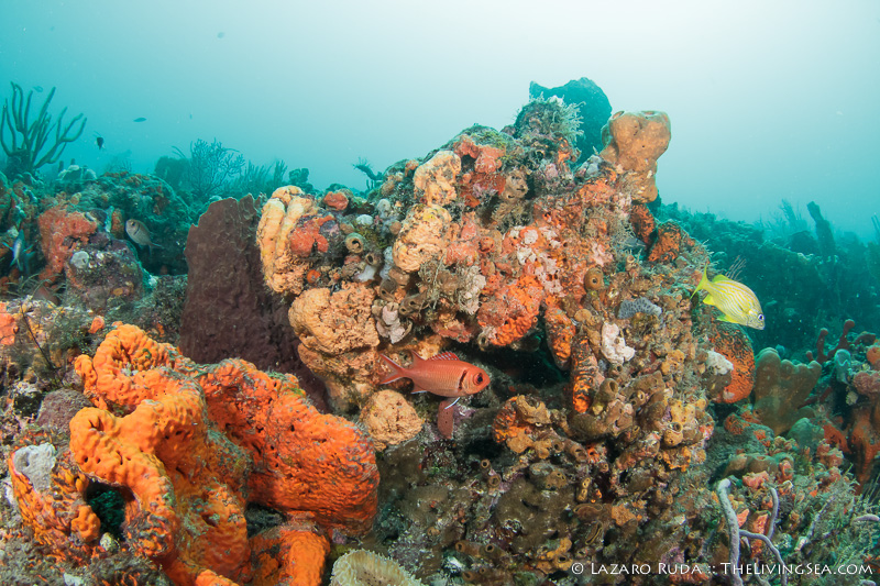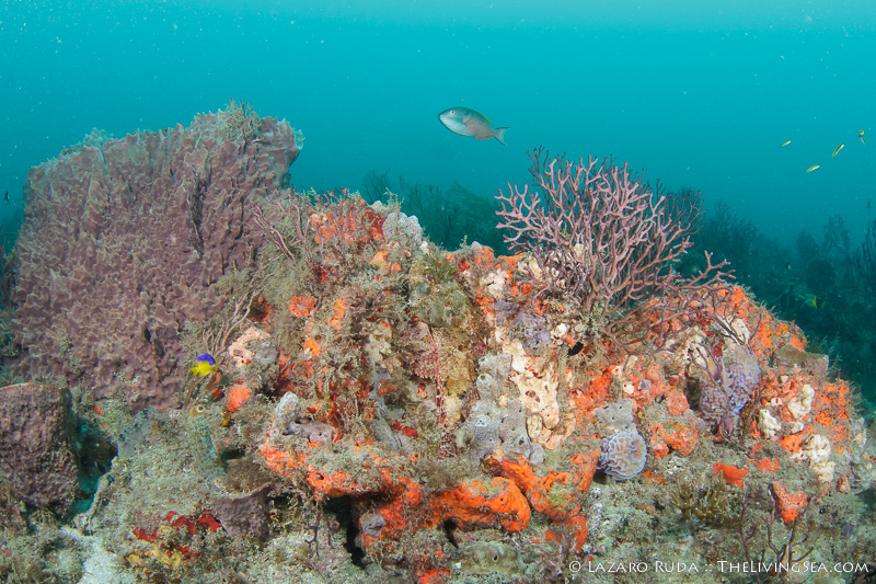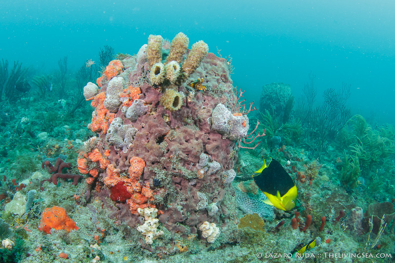 Upon descending to the reef, the group came across a turtle and two large goliath groupers. A gang of reef fish appeared to be squabbling about something as they faced each other with mouths agape. Eels of all sorts hid in the maze of soft corals and sponges. Angelfish circled each other high up in the water column. A close look at the reef revealed all sorts of miniature marvels.