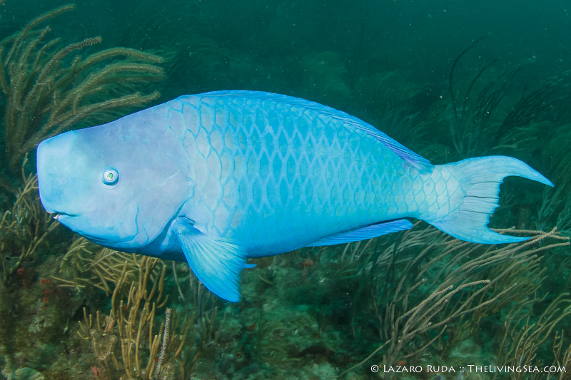 We reached the eastern end of The Trench where the school of glassy sweepers swam in unison above the extinguished outflow pipe. With hardly a trickle of north current and visibility down into the 30s, I noticed the fish seemed a little more at ease. Many of them swam higher up in the water column. One blue parrotfish, surprisingly, swam alongside me. These beautiful fish have always evaded me; always keeping a safe distance from me and my camera. I was elated to have one swim alongside me for a few seconds.