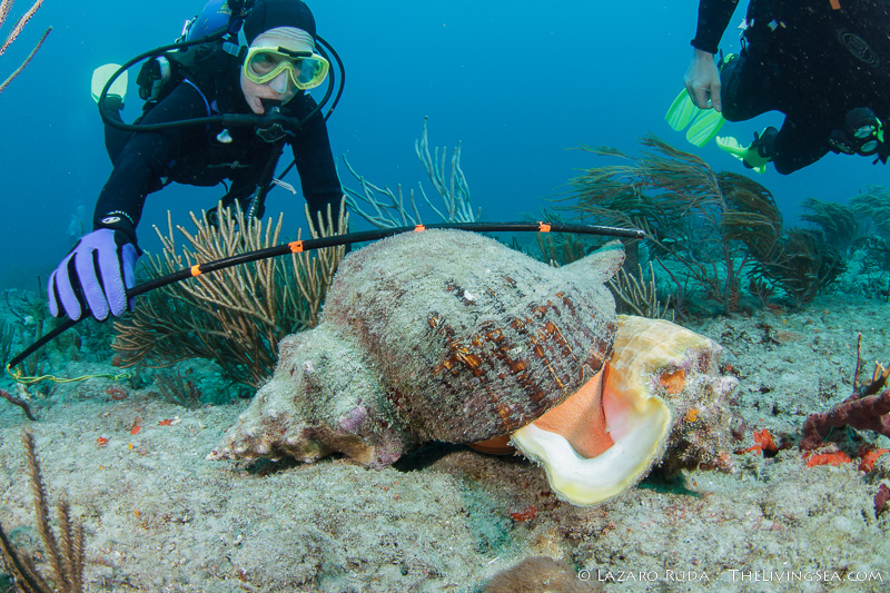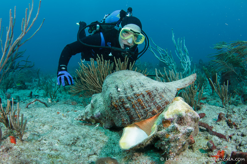 Shortly thereafter we were treated to some natural, predatory behavior right before our eyes. A large horse conch had flipped over a queen conch and was feeding on it. One diver was carrying a measuring stick with her and, according to our calculations, the horse conch measured at about 16 inches! These shells are the largest we have in Florida (not including Architeuthis Clam which I swear I saw during a night dive once. It was, easily, over 20 feet long!).