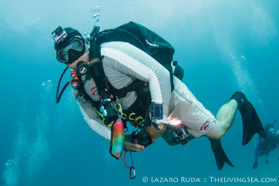 We headed to the southern shallow reefs. Our destination: Tear Drop and Dive-A-Rama reefs. These two reefs in the 50-60ft. range were teaming with a variety of life. First on the list of spectacular encounters was a large eagle ray, followed by countless sea turtles, and, of course, a plethora of tropical fish.