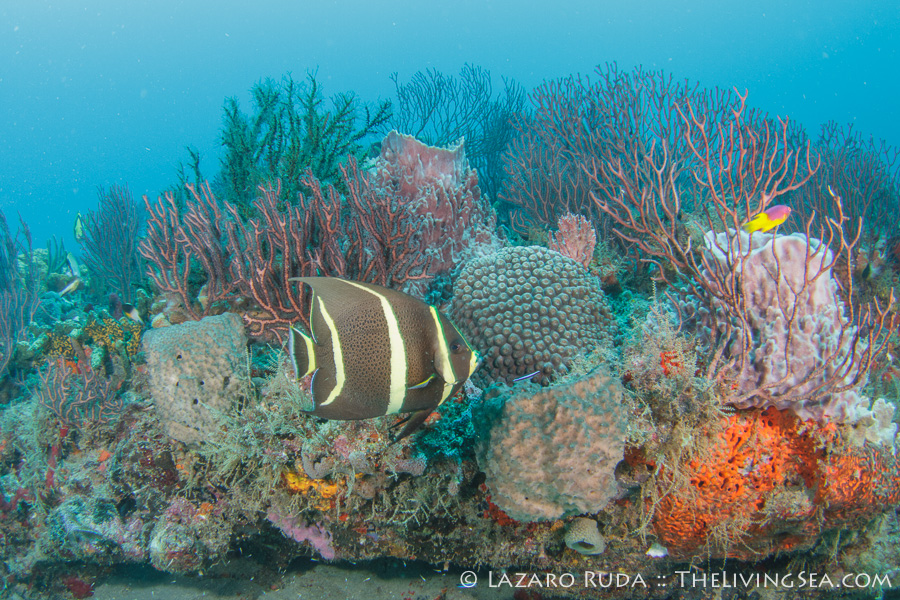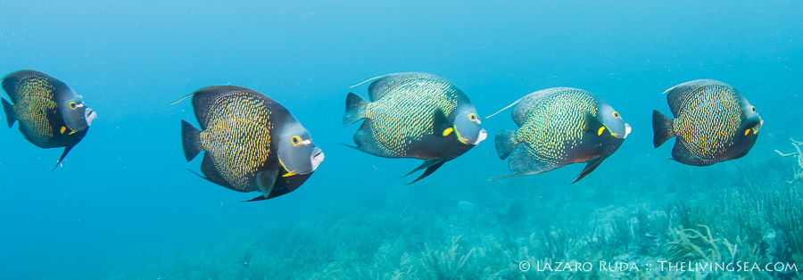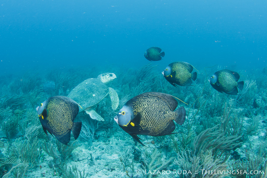 A swarm of french angelfish were traveling down the reef in a conga line. They circled each other in a mesmerizing dance. At one point they encircled a female loggerhead turtle, but the turtle quickly picked up and left. She was hoping for a little relaxation and wasn’t in the party mood, I suppose.