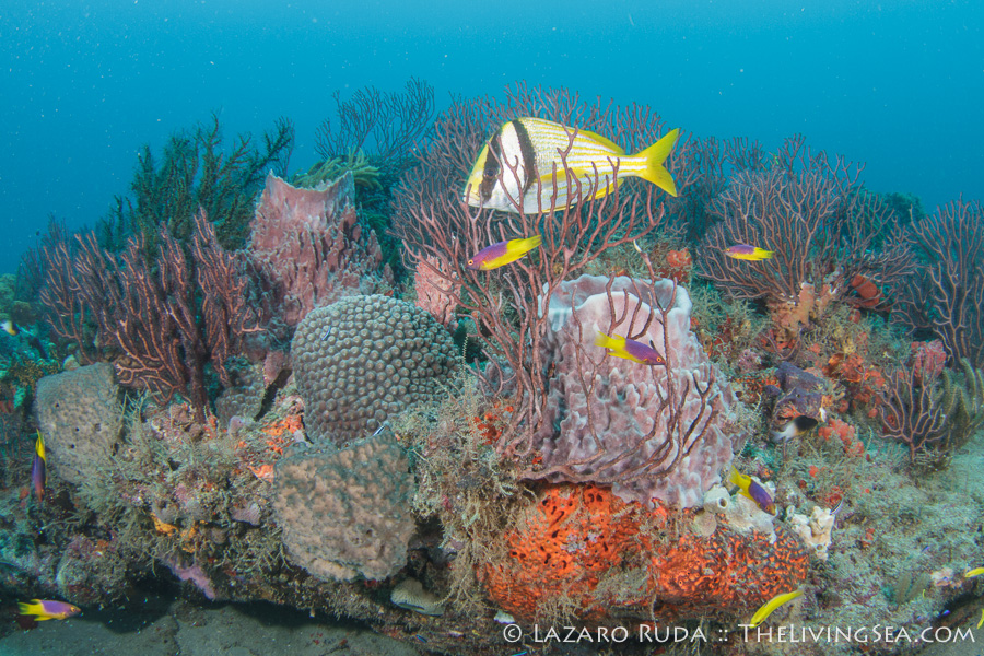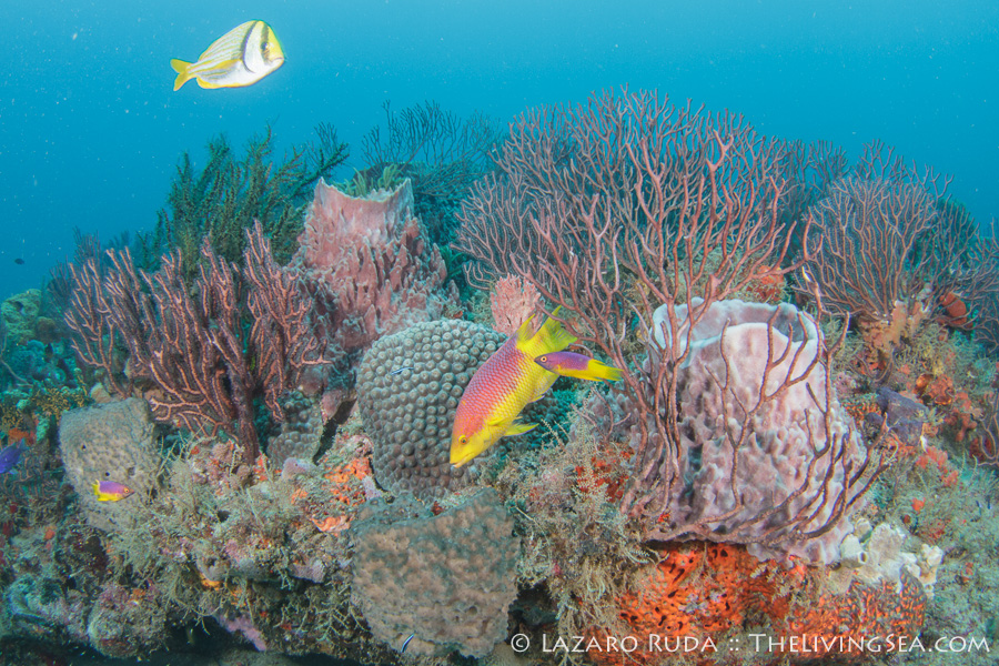 As I ventured to the eastern end of the reef, I came across numerous spots where tropical fish life seemed to congregate. Hovering over one spot I would have a conveyor-belt of different tropical fish swim in and out of the same photographic frame. It sure is an easy way to make any photographer become a little lazy. Why swim around searching for the right spots with the right creatures to photograph? Stay in one good spot and let the sea creatures come to you! Meanwhile, become mesmerized by the intricate beauty of the reef and all the tiny creatures living amongst this undersea tropical forest.