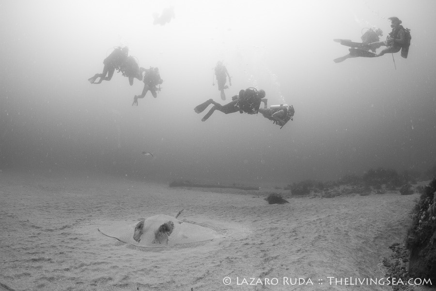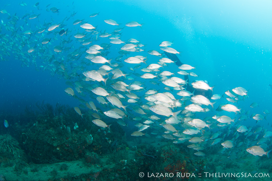 Our second dive on the Toy Box and Playpen was filled with tons of marine life, too. Included in the bunch were huge schools of grunts, a large stingray, and a lonesome goliath grouper.