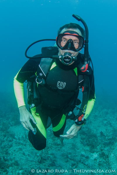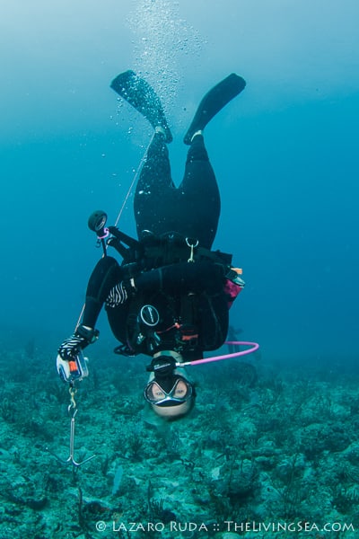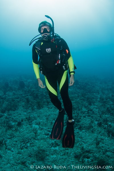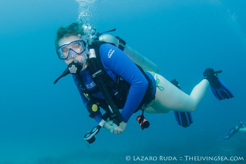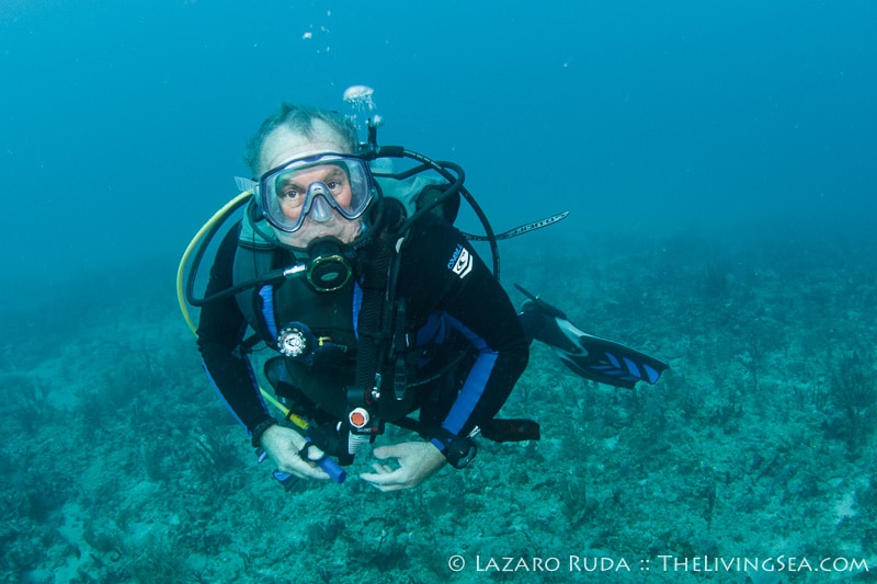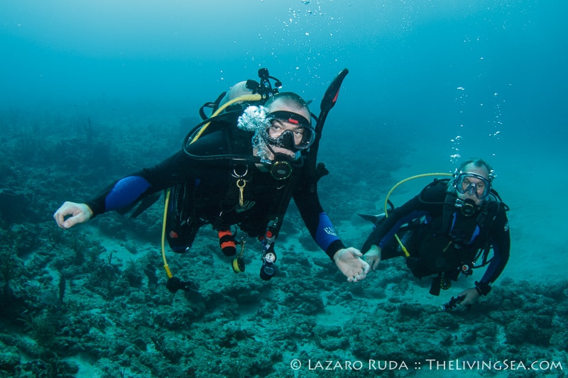 For our second reef dive we headed a little north to Ron’s reef. This popular dive site has a sandy east-west ravine where numerous large animals love to congregate. As soon as the divers descended near the bottom we began to explore the 10-15 foot ledge. I could hear the barking sounds of a goliath grouper in the distance. As our guide, Lindsay, turned the corner of Ron’s Rock she spotted a 8-10 foot nurse shark hiding between the rocky reef crevice. The shark stuck around while the divers observed and photographed it.