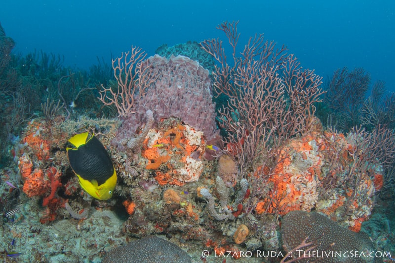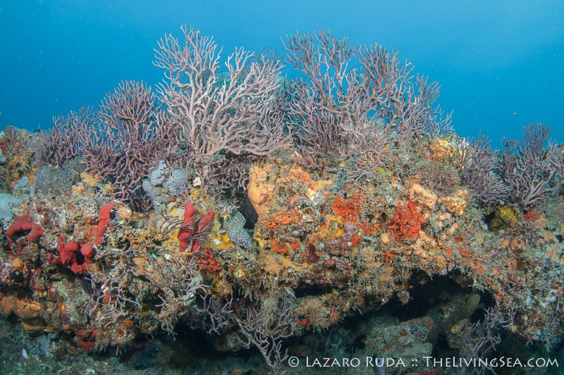 Continuing along with the southern current, we encountered numerous eels and tons of tropical fish. I ventured off into the eastern end of the reef for a while to see what surprises the ocean had in store for me there. A forest of soft corals swayed in the current. While not as fishy as the western edge of the reef, certain areas seem to attract what tropical fish are in the area and it is quite striking to see such a swirl of rainbow-colored fish flirting in and out of these patches of soft corals, giant barrel sponges, and hard corals.